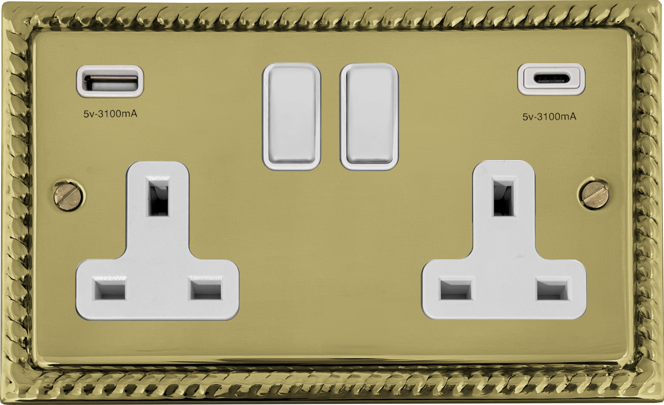 Monarch Polished Brass Double Socket with USB (USB-A and USB-C/White Switches) - G+H MB911W