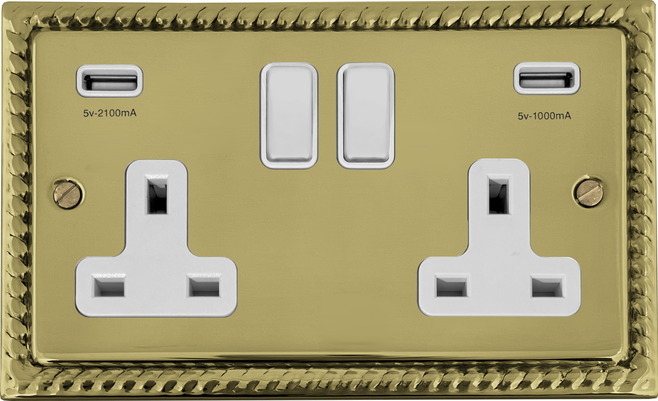 Monarch Polished Brass Double Socket with USB (White Switches) - G+H MB910W