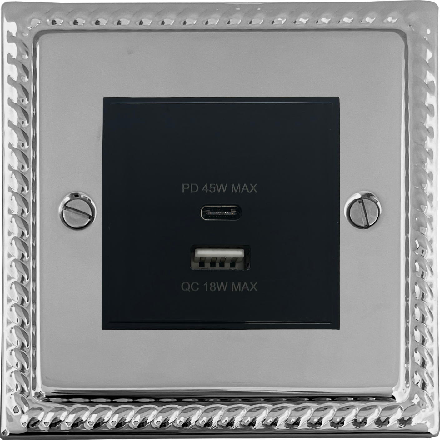 Monarch Polished Chrome USB Charger (Dual USB A + C Quick Charge) (1 Gang/Black Insert) - G+H MC43B