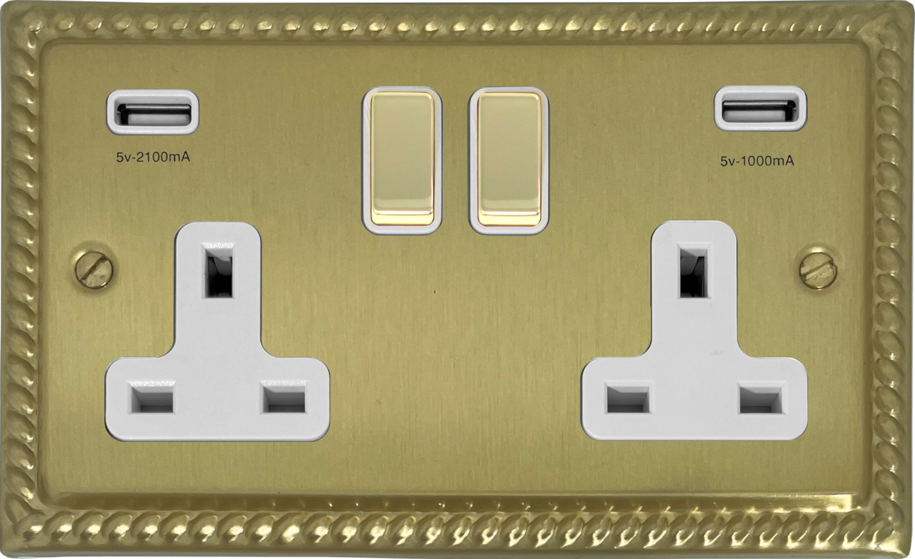 Monarch Satin Brass Double Socket with USB (Brass Switch/White Insert) - G+H MSB2910