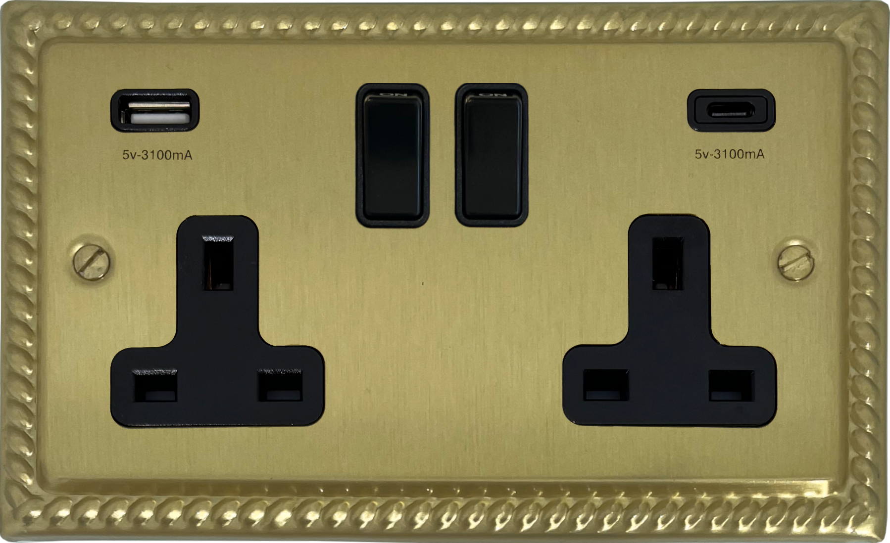 Monarch Satin Brass Double Socket with USB (USB-A and USB-C/Black Switch) - G+H MSB911B