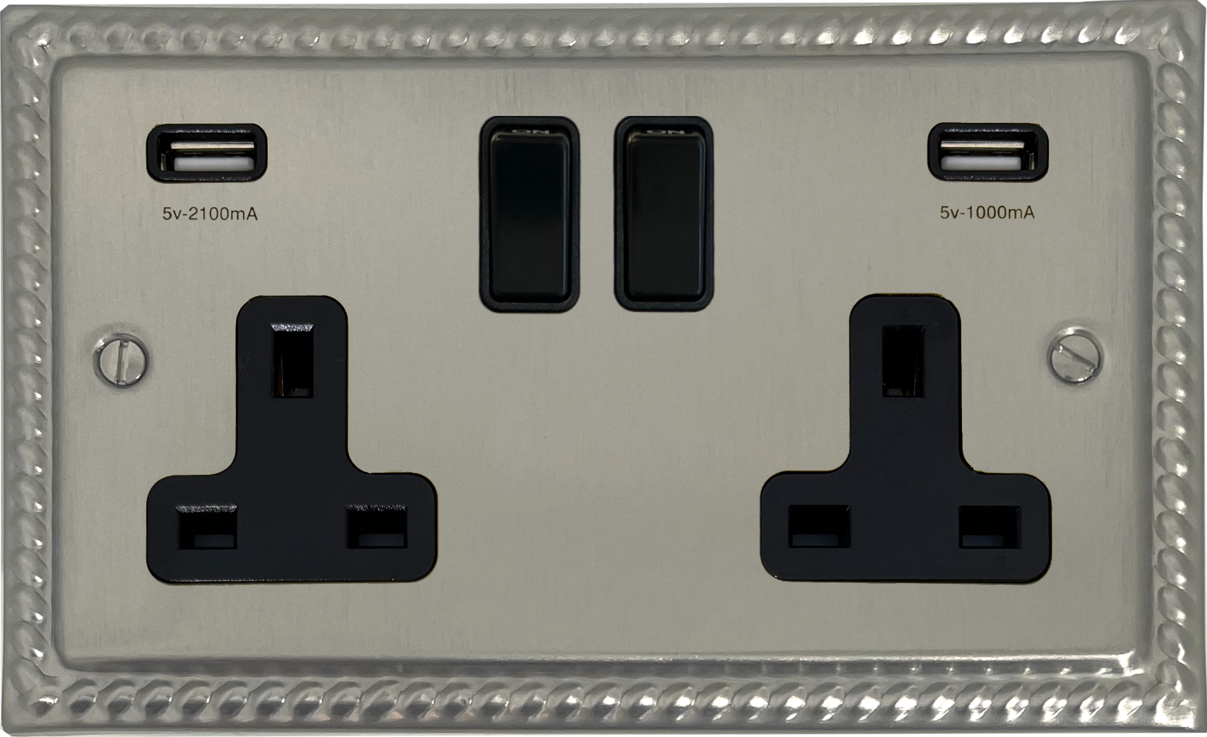 Monarch Satin Nickel Double Socket with USB (Black Switch) - G+H MSN910B