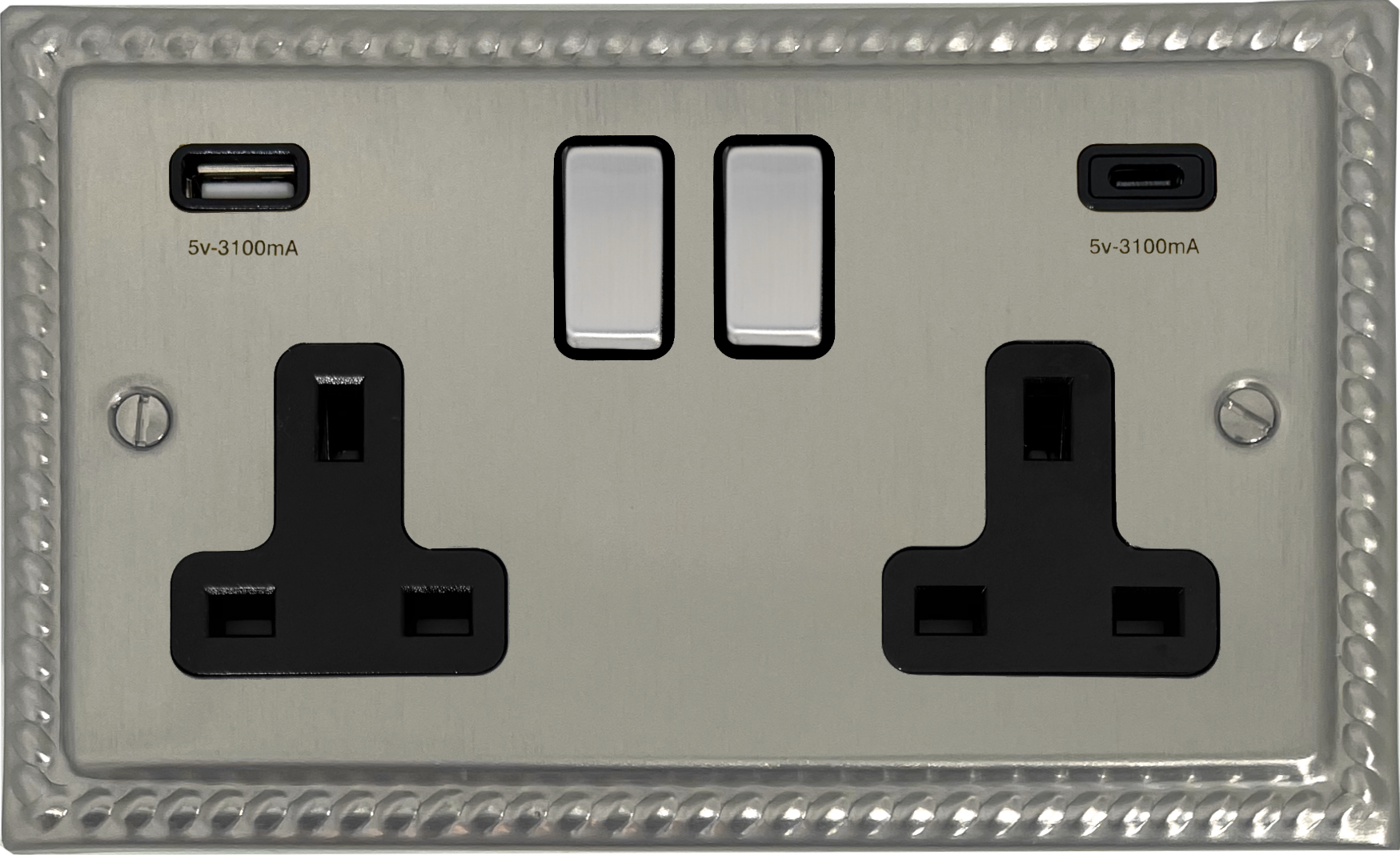 Monarch Satin Nickel Double Socket with USB (USB-A and USB-C/Black Insert/Matching Switch) - G+H MSN3911