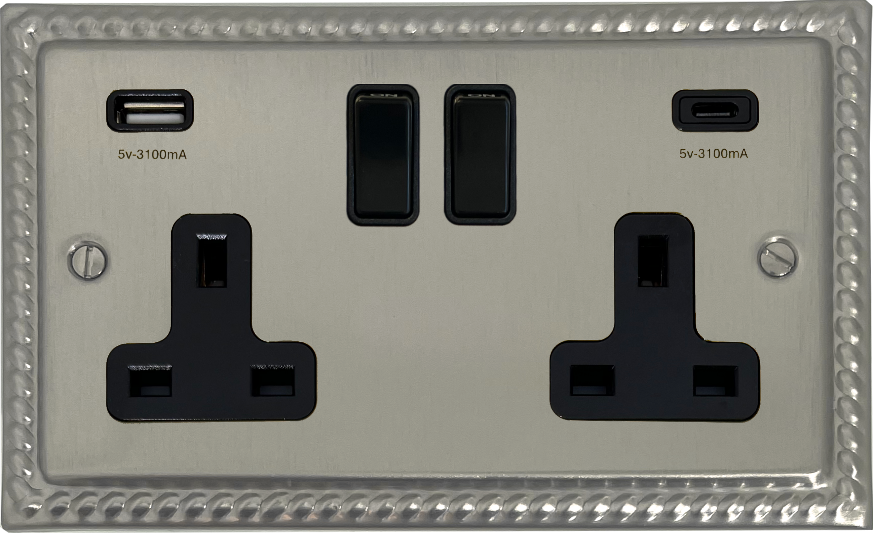 Monarch Satin Nickel Double Socket with USB (USB-A and USB-C/Black Switches) - G+H MSN911B