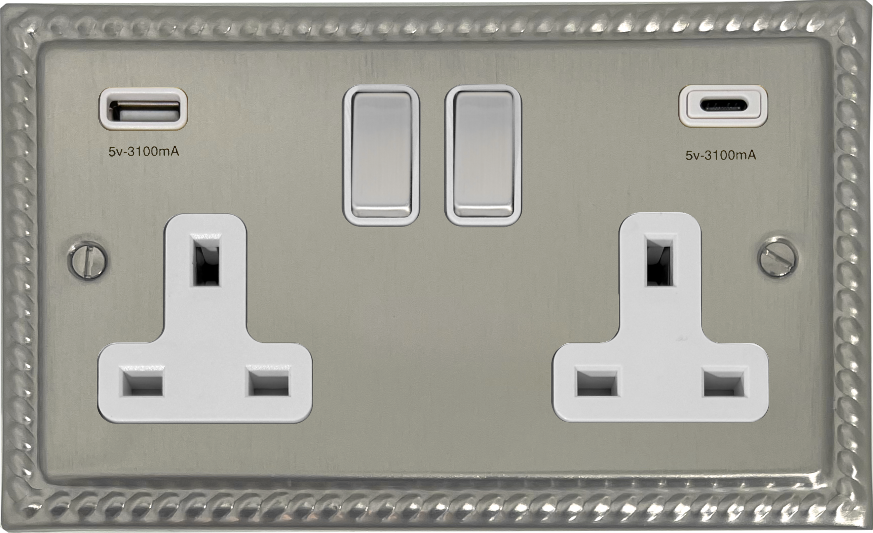 Monarch Satin Nickel Double Socket with USB (USB-A and USB-C/White Insert/Matching Switch) - G+H MSN2911