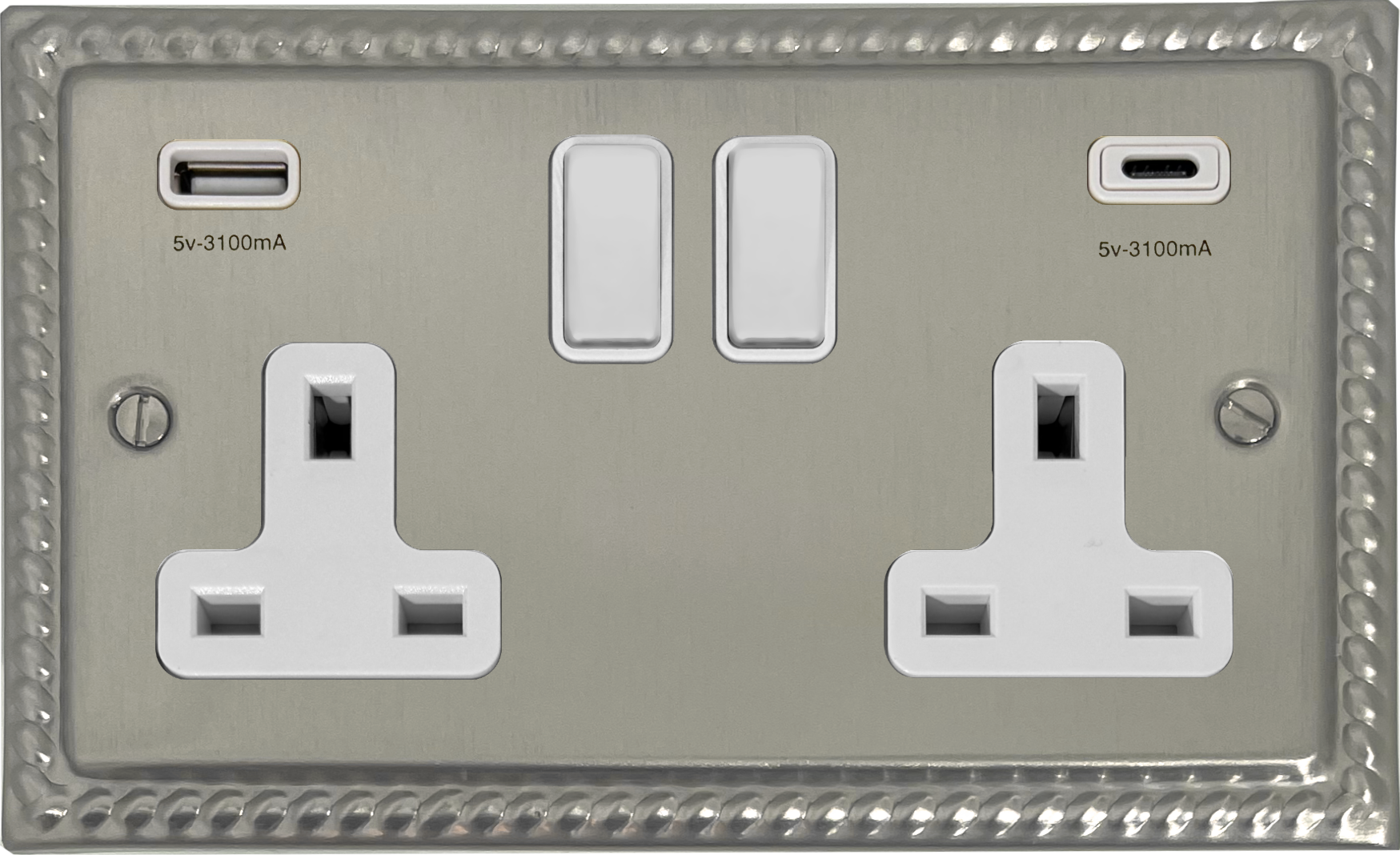 Monarch Satin Nickel Double Socket with USB (USB-A and USB-C/White Switches) - G+H MSN911W