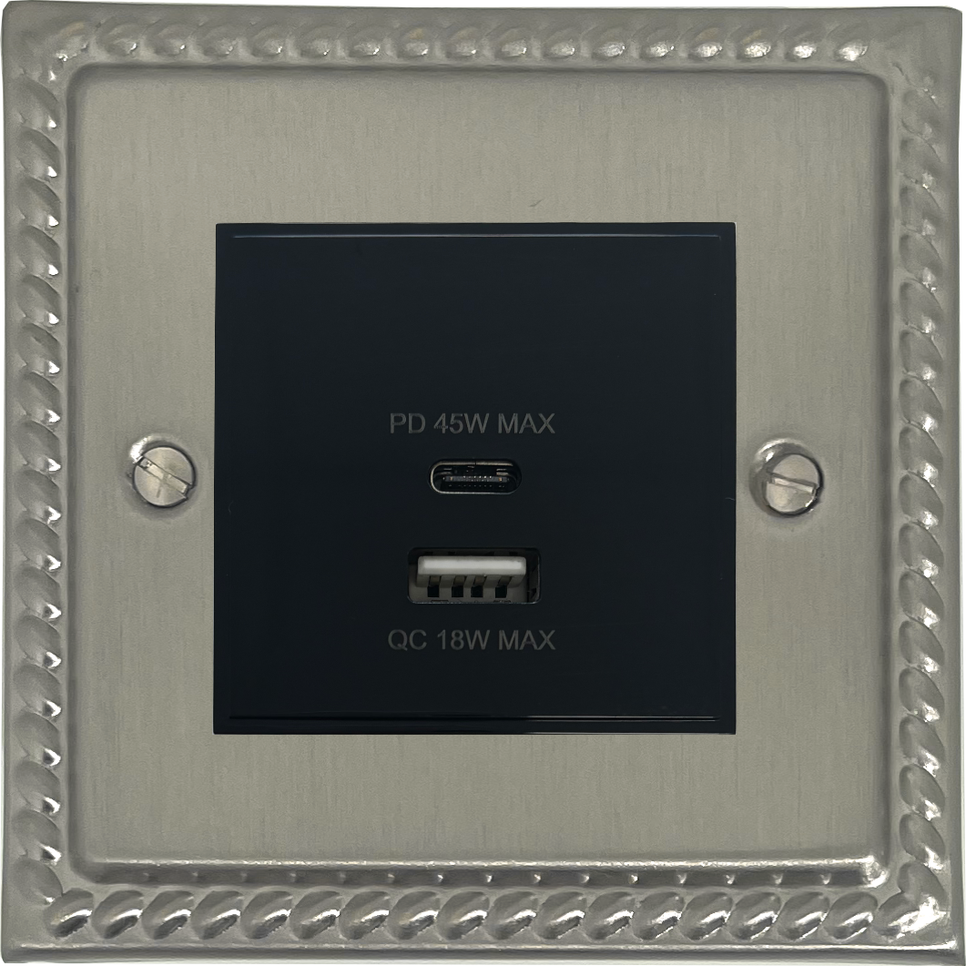 Monarch Satin Nickel USB Charger (Dual USB A + C Quick Charge) (1 Gang/Black Insert) - G+H MSN43B