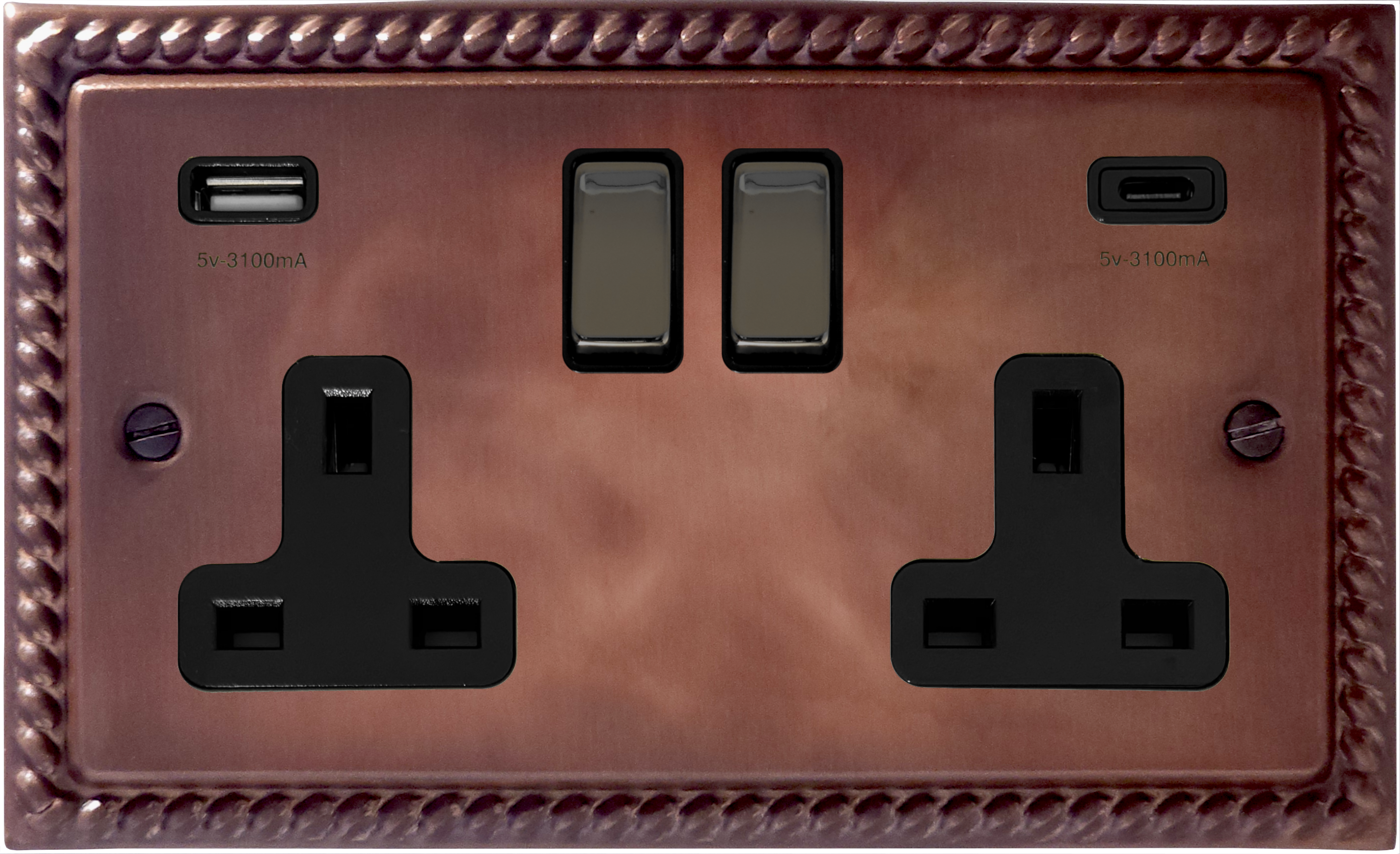 Monarch Tarnished Copper Double Socket with USB (USB-A and USB-C/Black Nickel Switches)