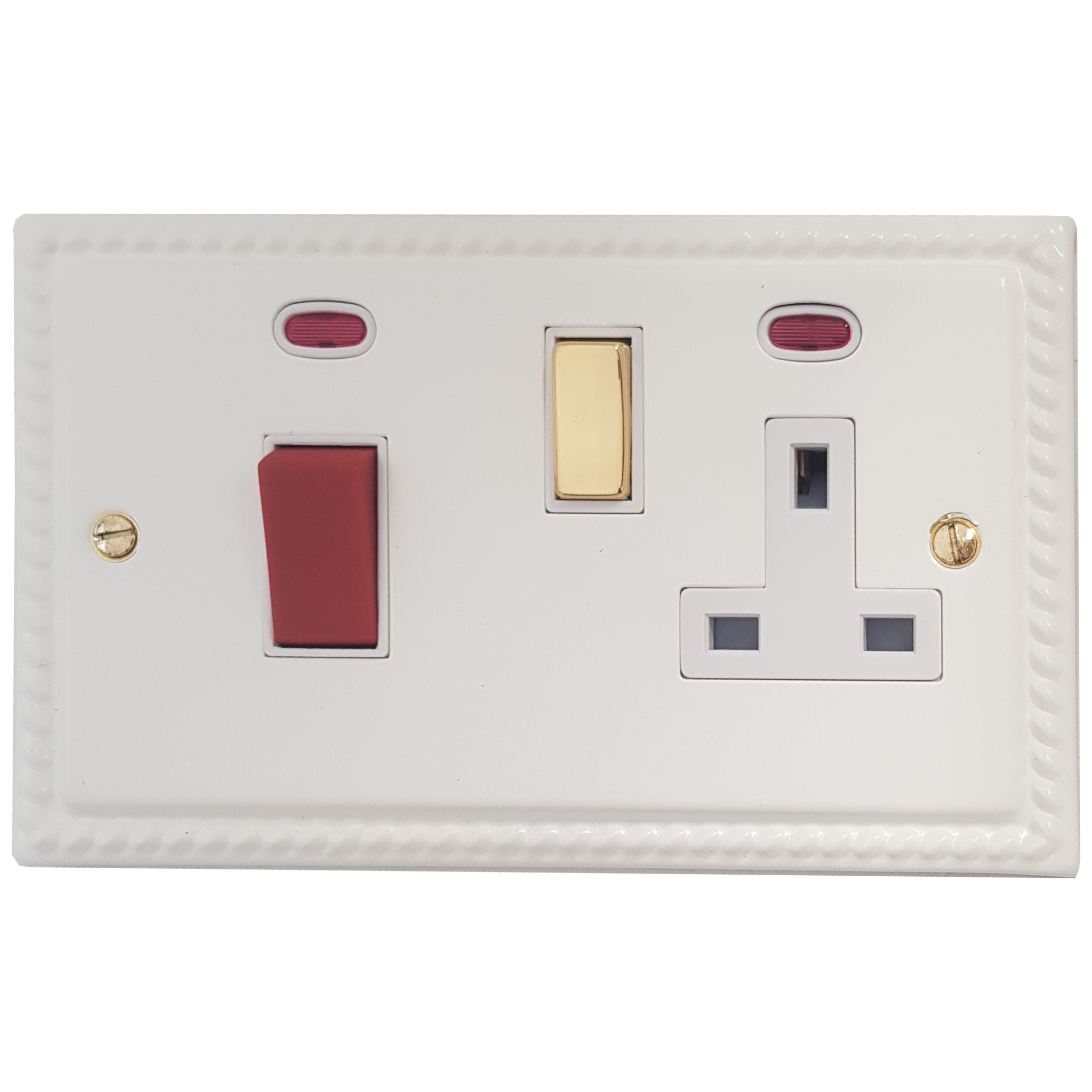 Monarch White Cooker Switch with Socket (White inserts/Red/Polished Brass Switch) - G+H MW229-PB