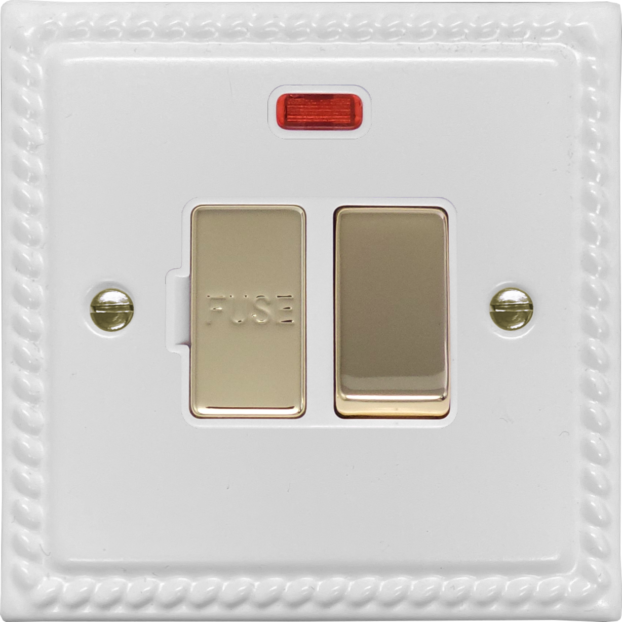 Monarch White Switched Fused Spur with Neon (White insert/Polished Brass Switch)