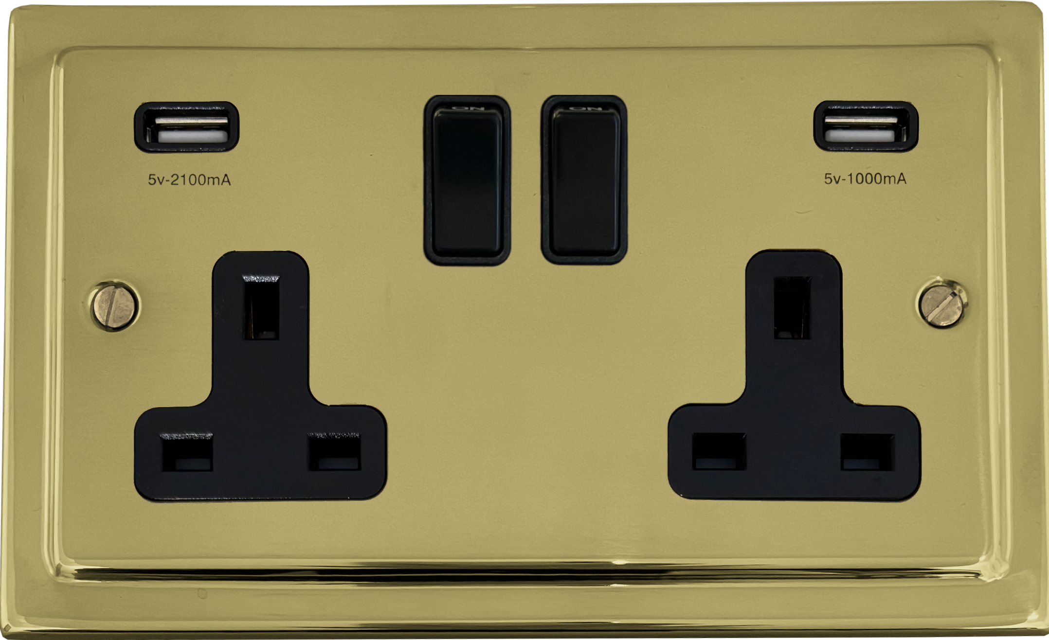 Polished Brass Unlaquered Double Socket with USB (Black Switches) - G+H TBUL910B