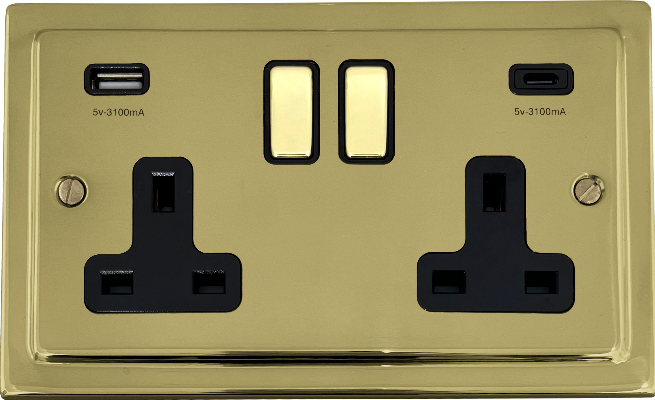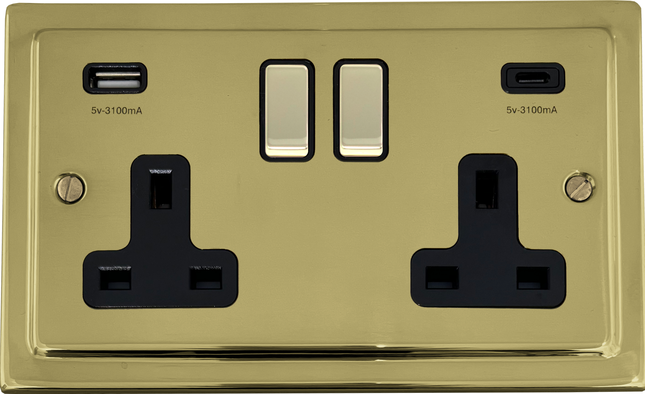 Polished Brass Unlaquered Double Socket with USB (USB-A and USB-C/Black Inserts Brass Switches) - G+H TBUL3911