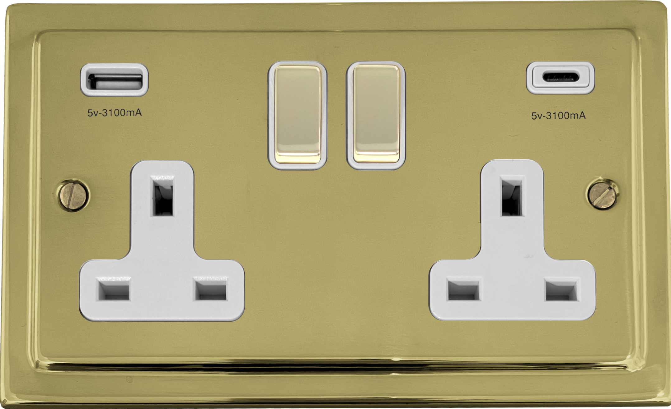 Polished Brass Unlaquered Double Socket with USB (USB-A and USB-C/White Inserts Brass Switches) - G+H TBUL2911