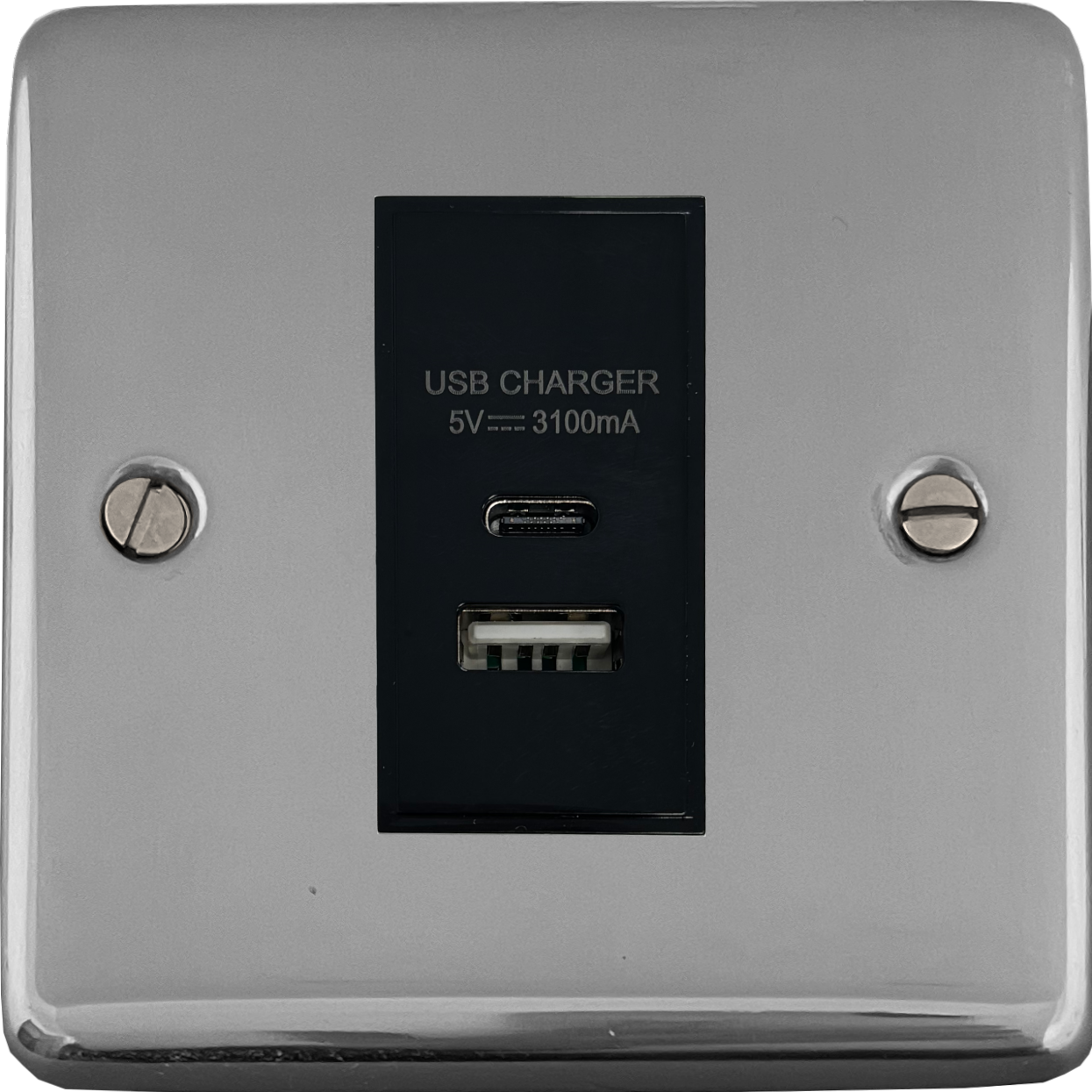 Polished Chrome USB Charger (USB-A and USB-C) (1 Gang/Black Insert) - G+H CC41B