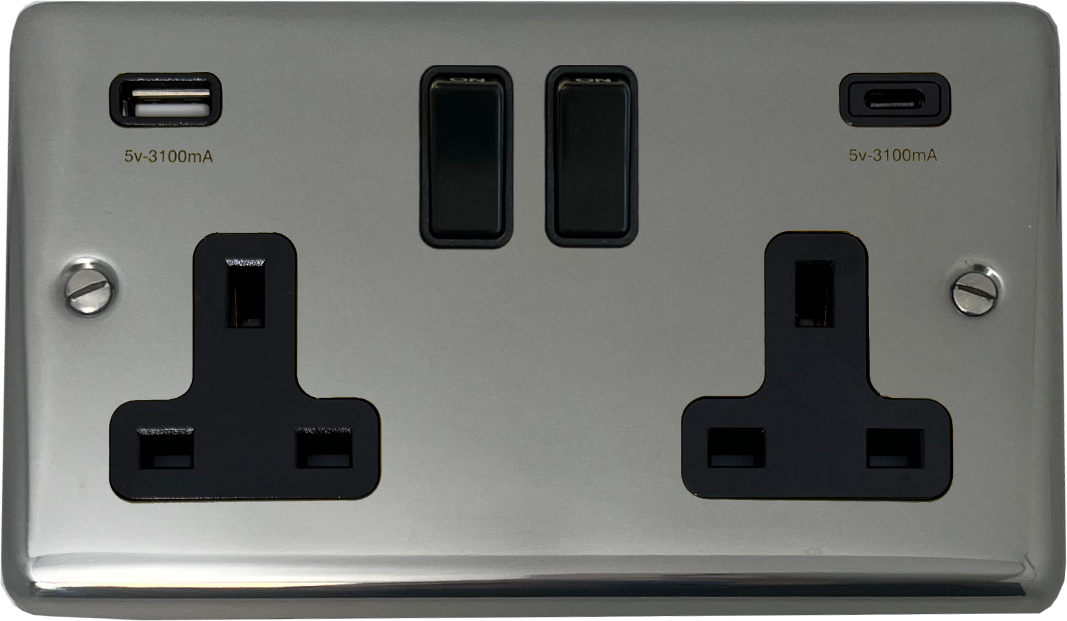 Polished Steel Double Socket with USB (2 Gang/USB-A and USB-C/Black Switches) - G+H CPS911B