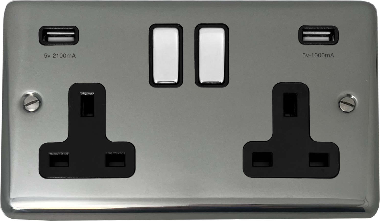 Polished Steel Double Socket with USB (Black Inserts/Chrome Switches) - G+H CPS3910
