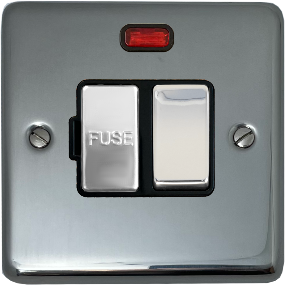 Polished Steel Switched Fused Spur with Neon (Black Insert/Chrome Switch) - G+H CPS327