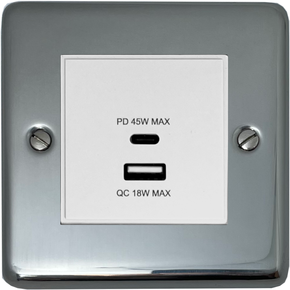 Polished Steel USB Charger (Dual USB A + C Quick Charge) (1 Gang/White Insert) - G+H CPS43W