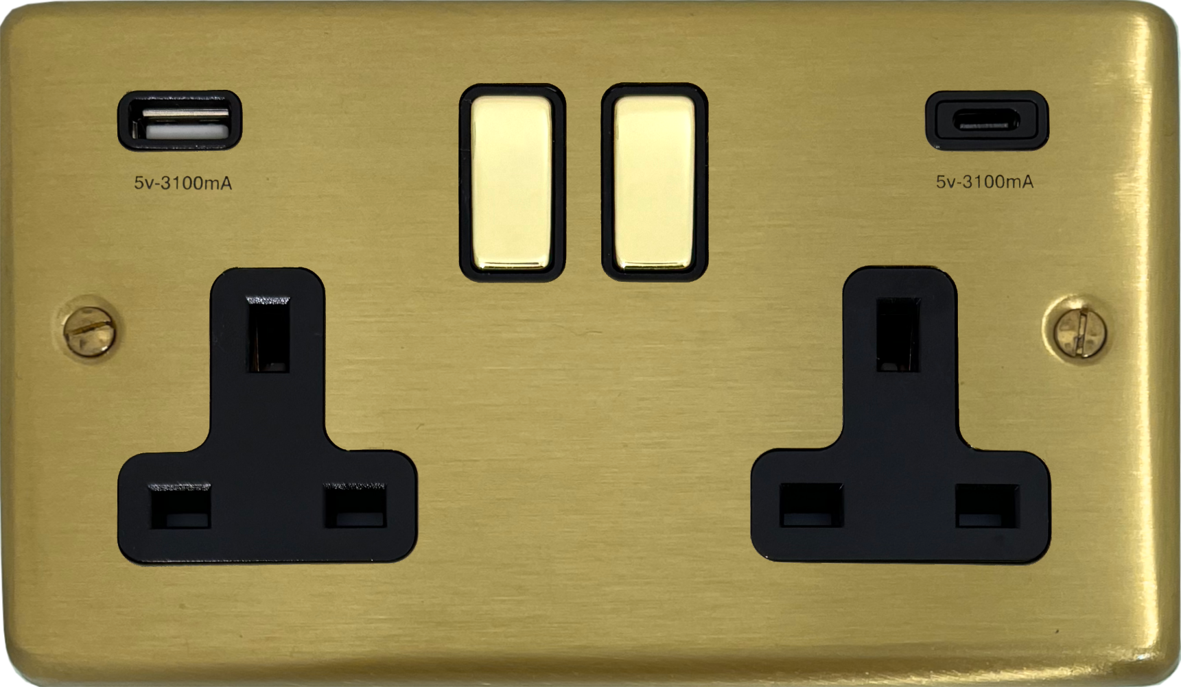 Satin Brass Double Socket with USB (USB-A and USB-C/Black Inserts Brass Switches) - G+H CSB3911