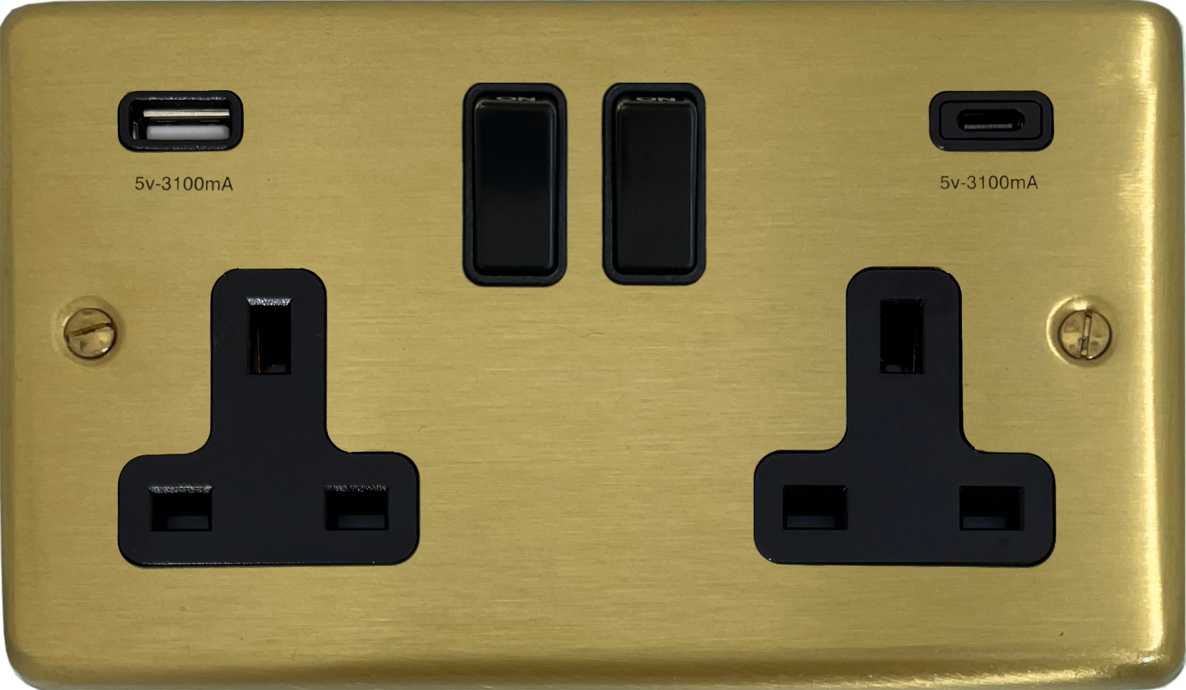Satin Brass Double Socket with USB (USB-A and USB-C/Black Switches) - G+H CSB911B