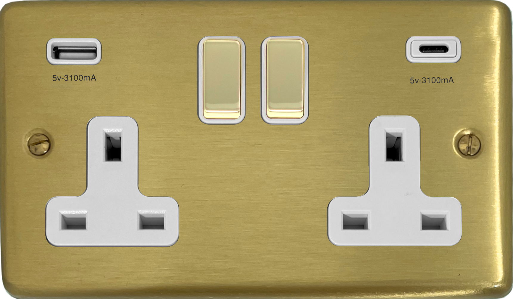 Satin Brass Double Socket with USB (USB-A and USB-C/White Inserts Brass Switches) - G+H CSB2911