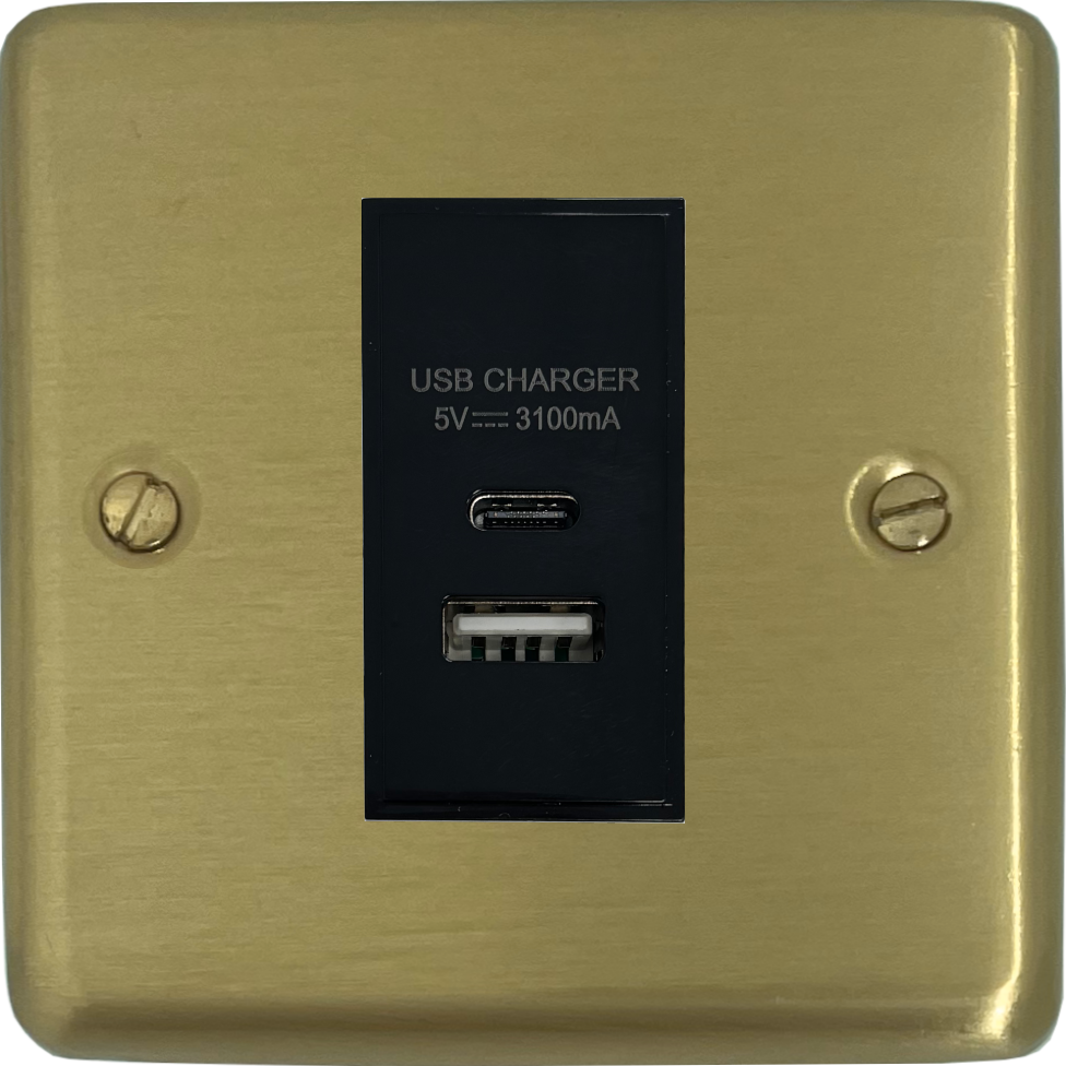Satin Brass USB Charger (USB-A and USB-C/Black Insert ) - G+H CSB41B