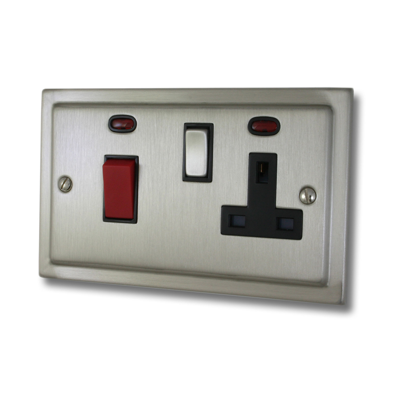 Satin Nickel Cooker Switch with Socket (Metal Switch/Black Surround)