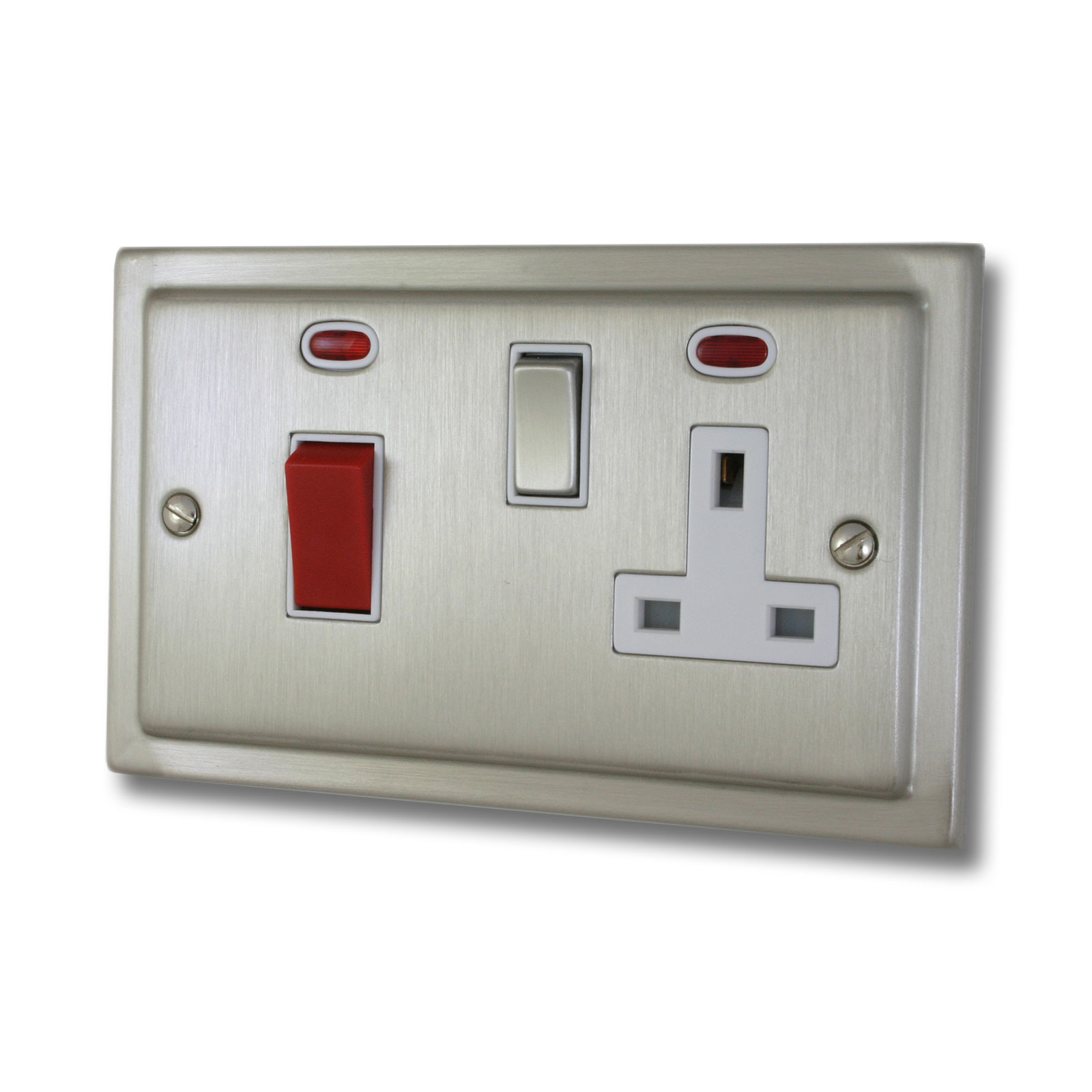 Satin Nickel Cooker Switch with Socket (Metal Switch/White Surround)