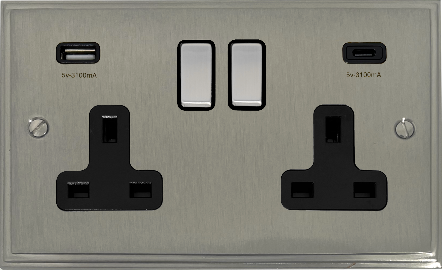 Satin Nickel Double Socket with USB (USB-A and USB-C/Black Inserts/Steel Switches) - G+H VSN3911