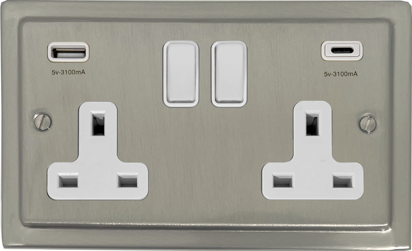Satin Nickel Double Socket with USB (USB-A and USB-C/Black Switches) - G+H TSN911W
