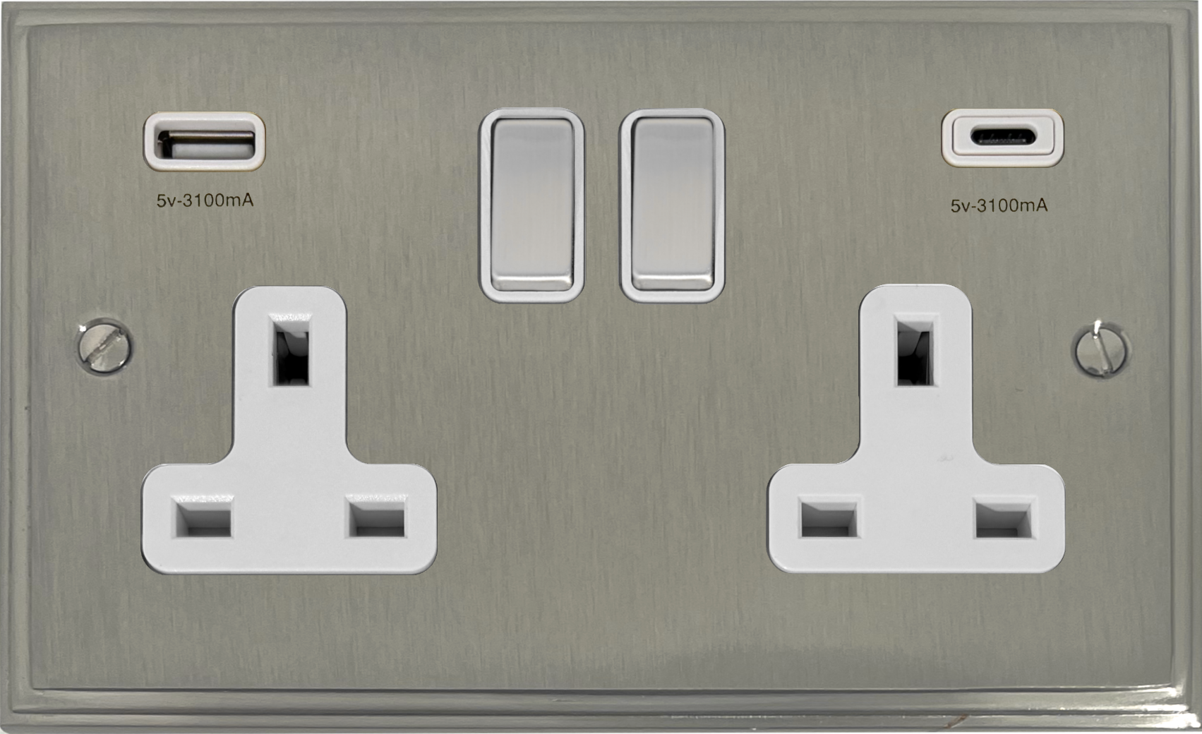 Satin Nickel Double Socket with USB (USB-A and USB-C/White Inserts/Steel Switches) - G+H VSN2911