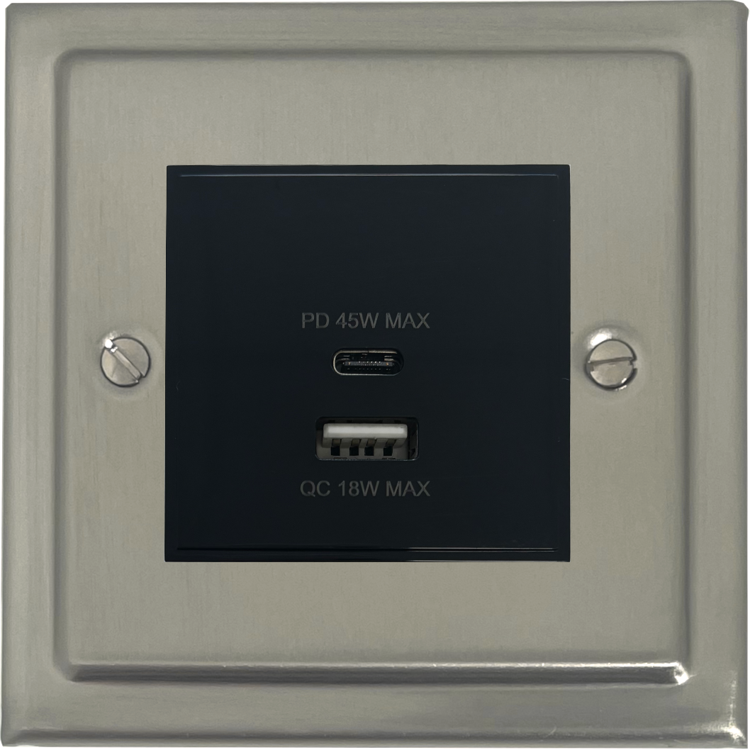 Satin Nickel USB Charger (Dual USB A + C Quick Charge) (1 Gang/Balck Insert) - G+H TSN43B