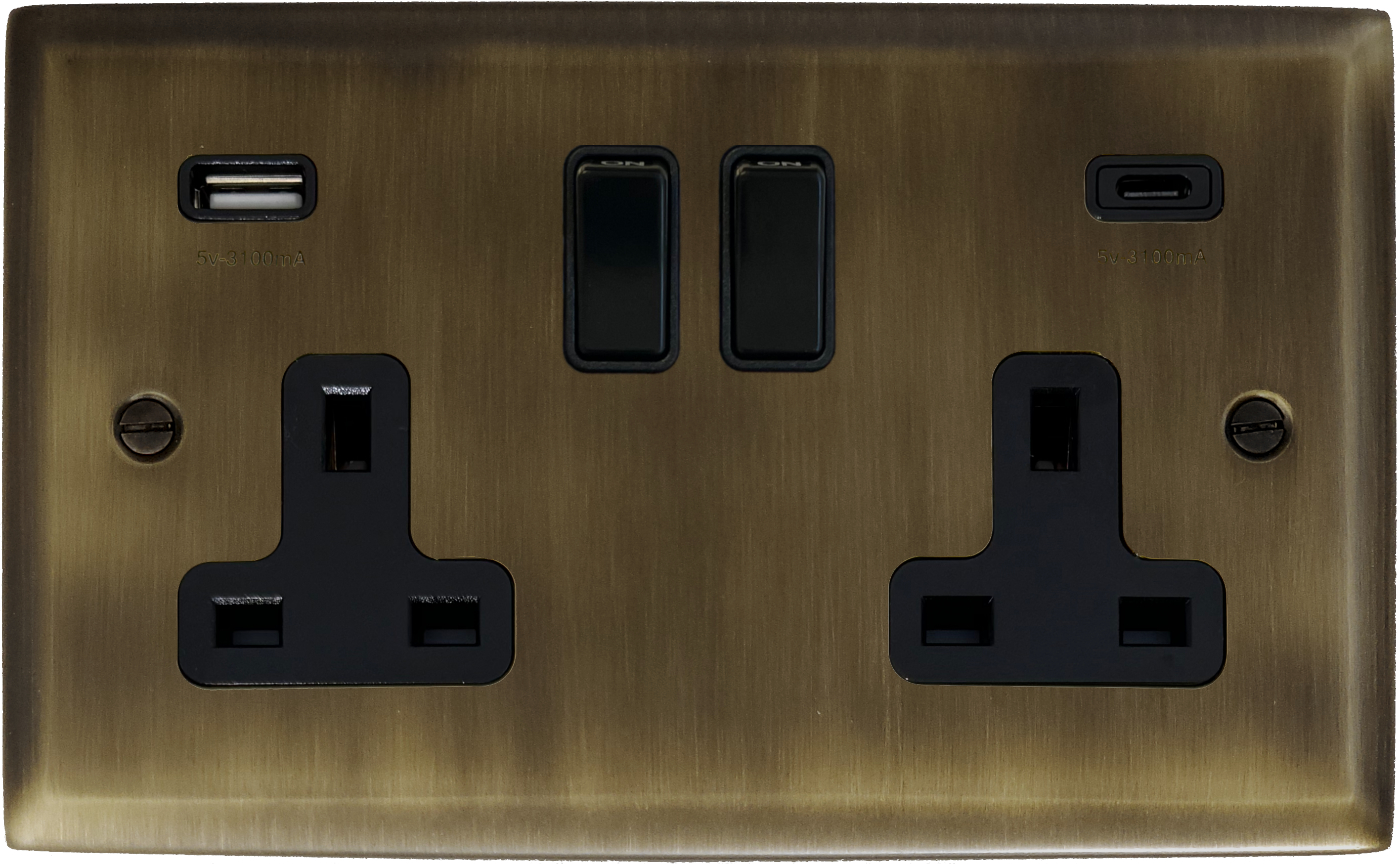 Spectrum Antique Brass Double Socket with USB (USB-A and USB-C/Black Switches) - G+H SAB911B