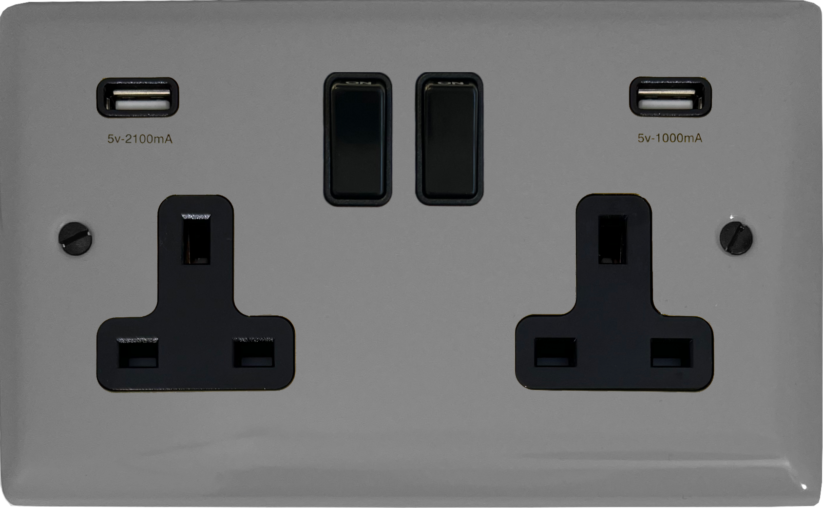 Spectrum Light Grey Double Socket with USB (Black Switches) - G+H SLG910B