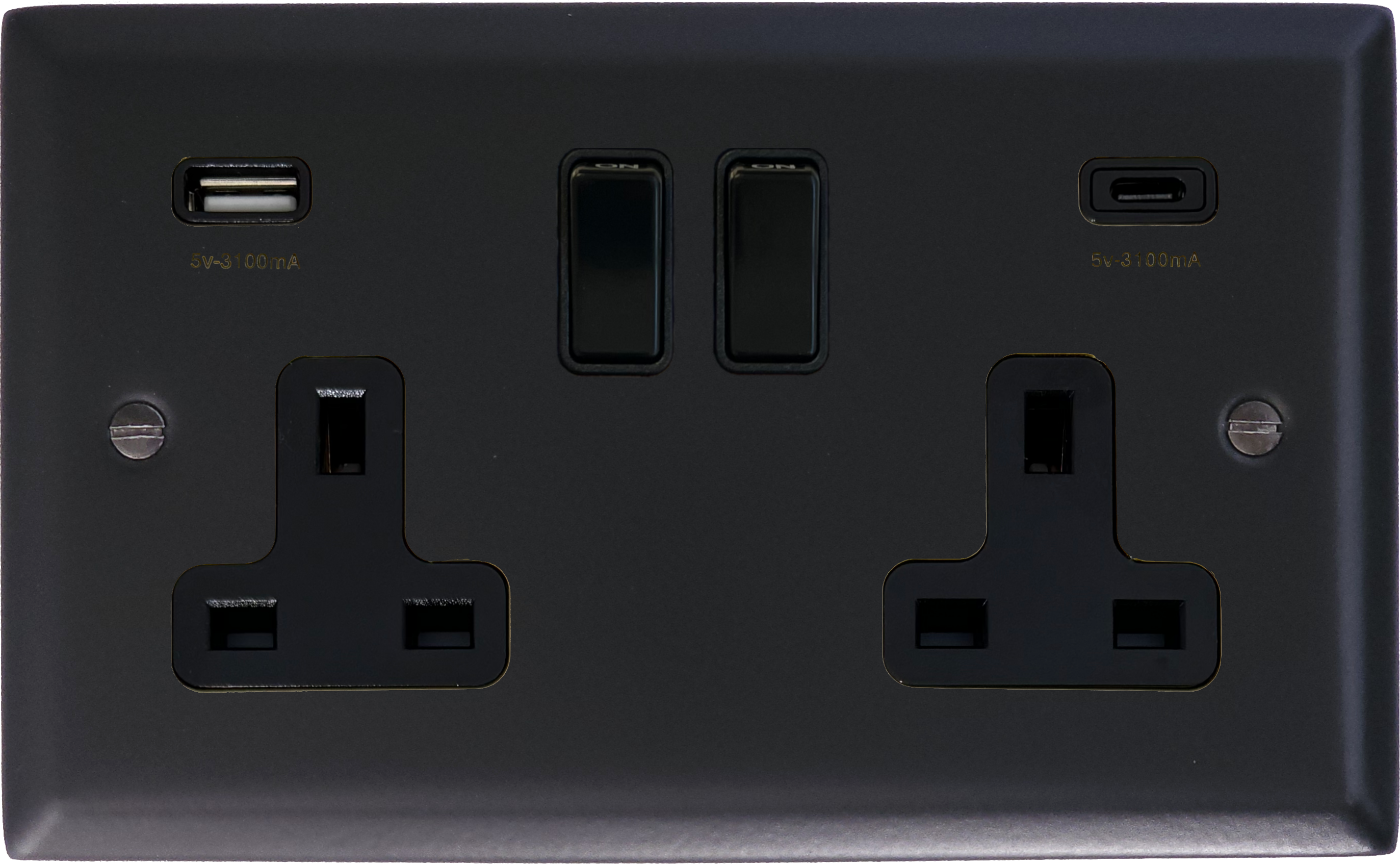 Spectrum Matt Black Double Socket with USB (2 Gang/USB-A and USB-C) - G+H SFB911B