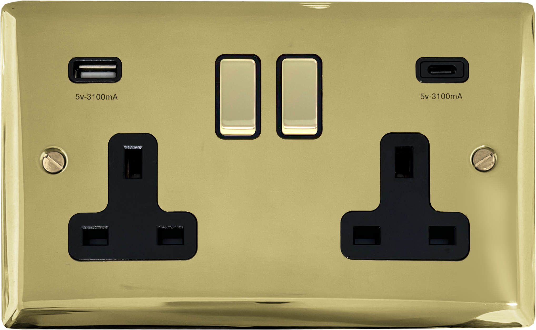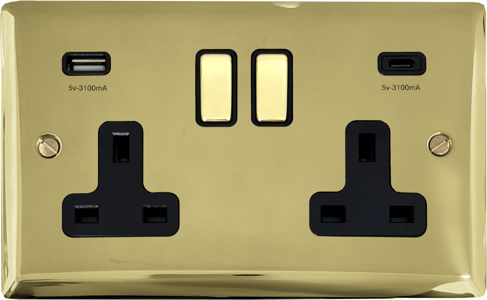 Spectrum Polished Brass Double Socket with USB (USB-A and USB-C/Black Inserts Brass Switches) - G+H SB3911
