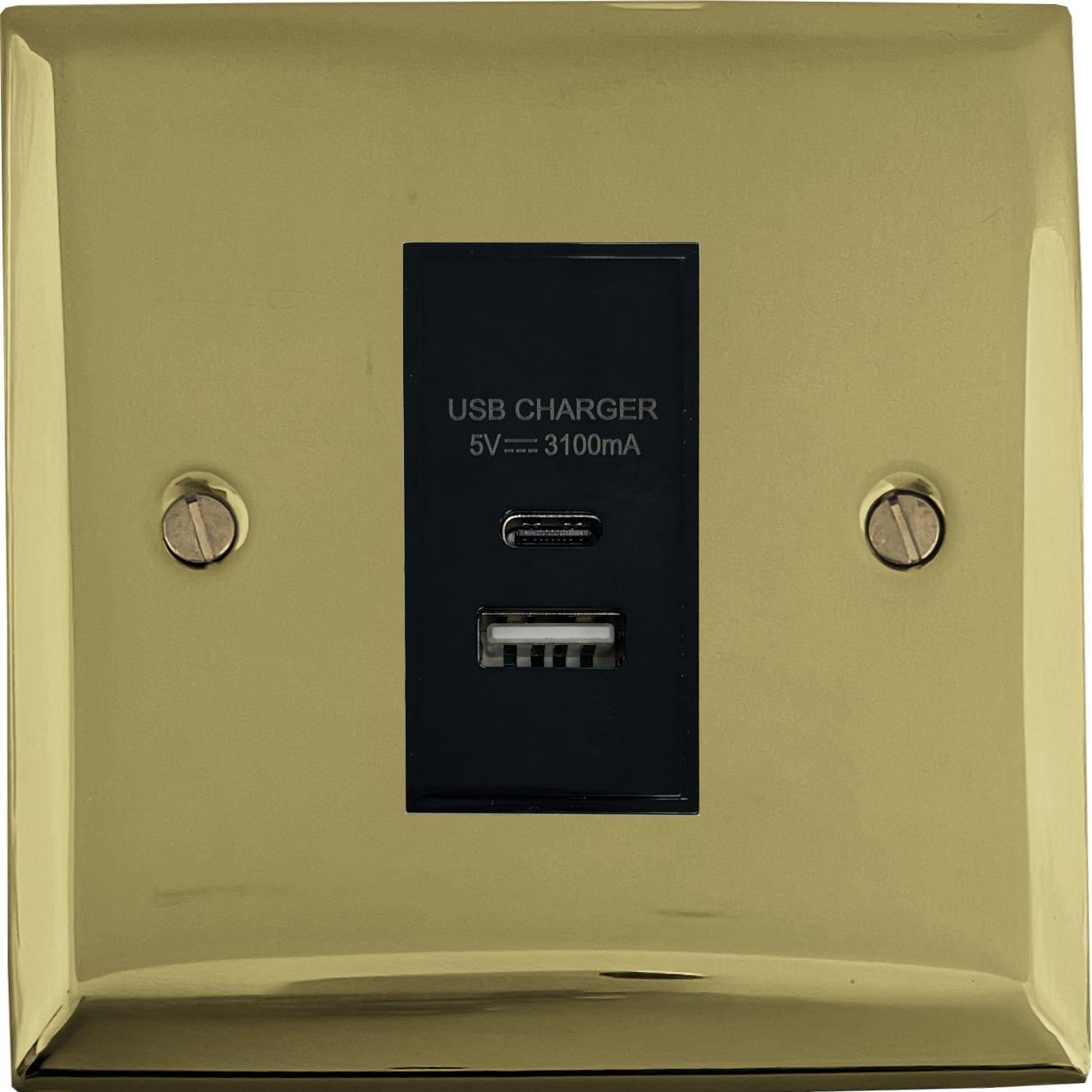 Spectrum Polished Brass USB Charger (USB-A and USB-C) (1 Gang/Black Insert) - G+H SB41B
