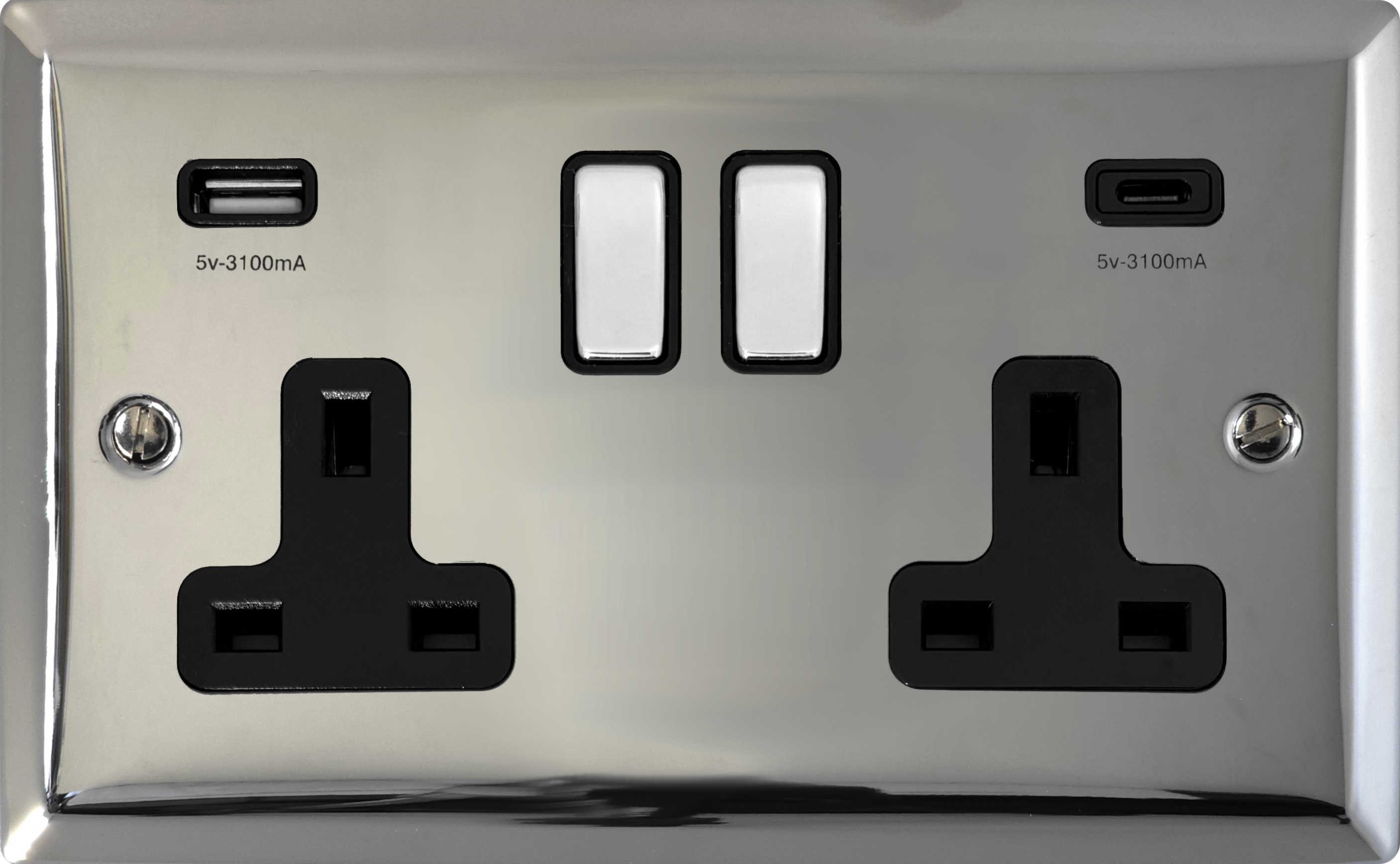 Spectrum Polished Chrome Double Socket (USB-A and USB-C/Black Insert/Chrome Switches) - G+H SC3911