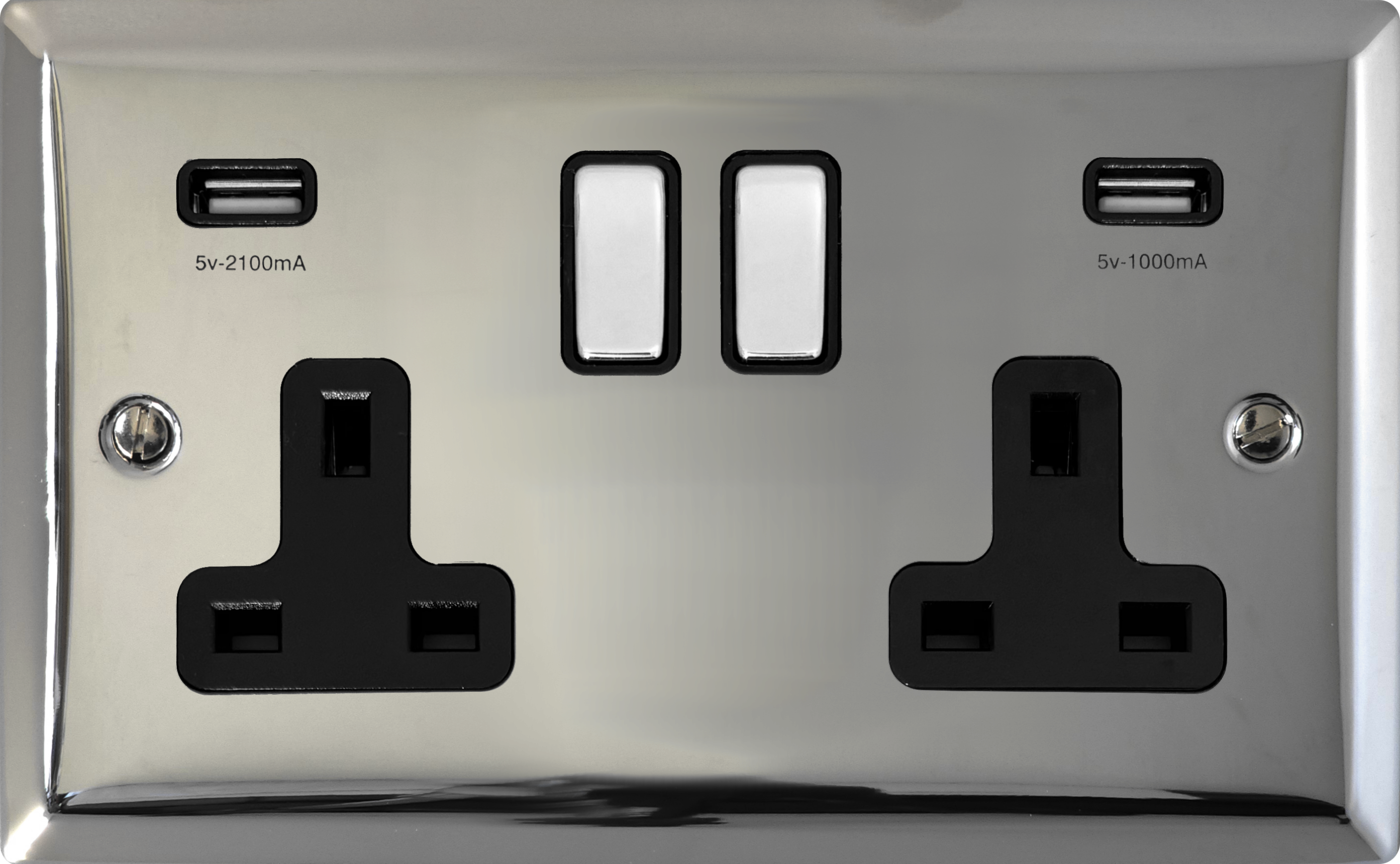Spectrum Polished Chrome Double Socket with USB (Chrome Switch/Black Inserts) - G+H SC3910