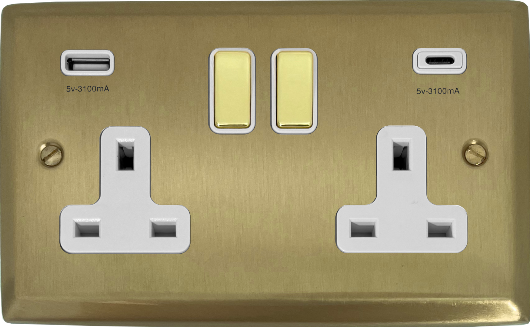 Spectrum Satin Brass Double Socket with USB (USB-A and USB-C/White Inserts/Polished Brass Switches) - G+H SSB2911
