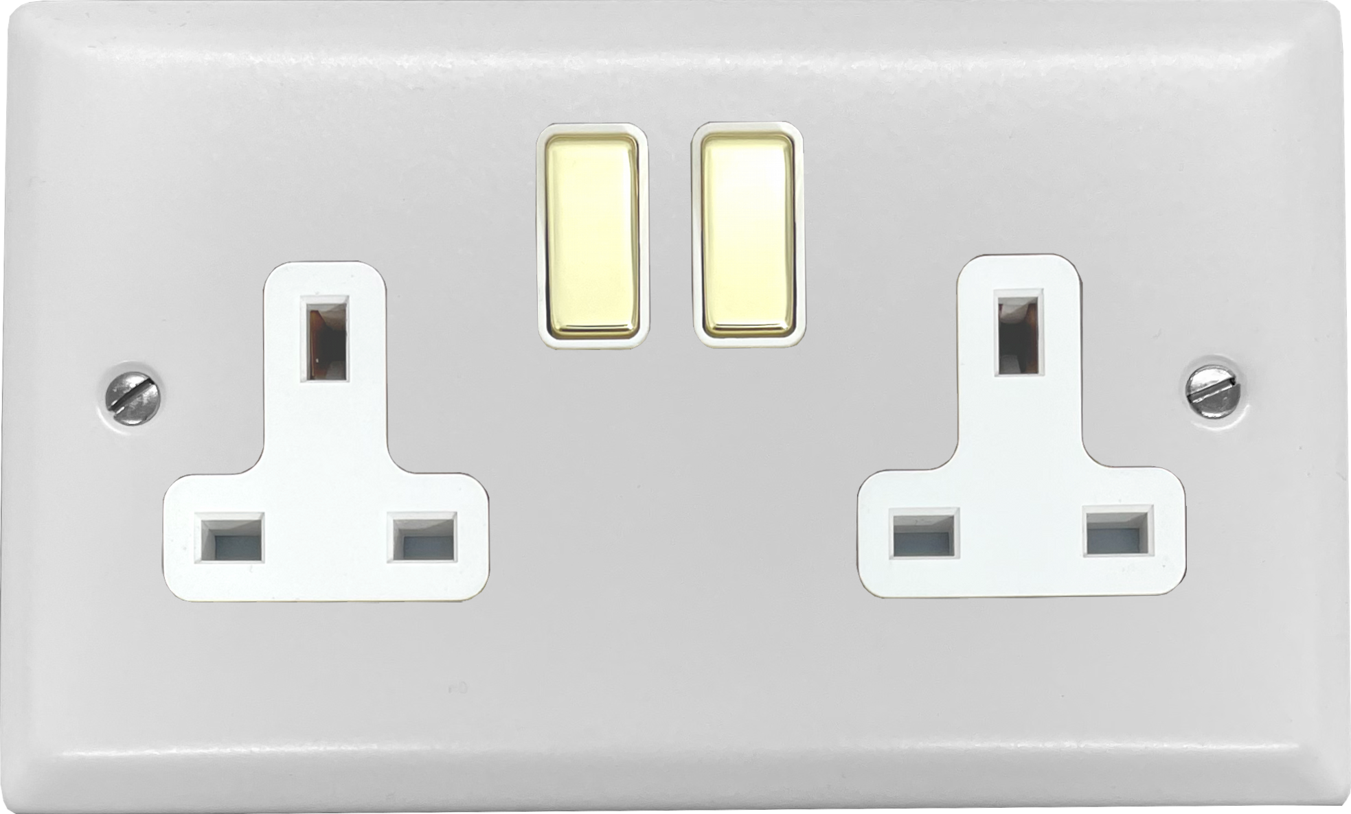 Spectrum White Double Socket (White Insert/ Polished Brass Switches)