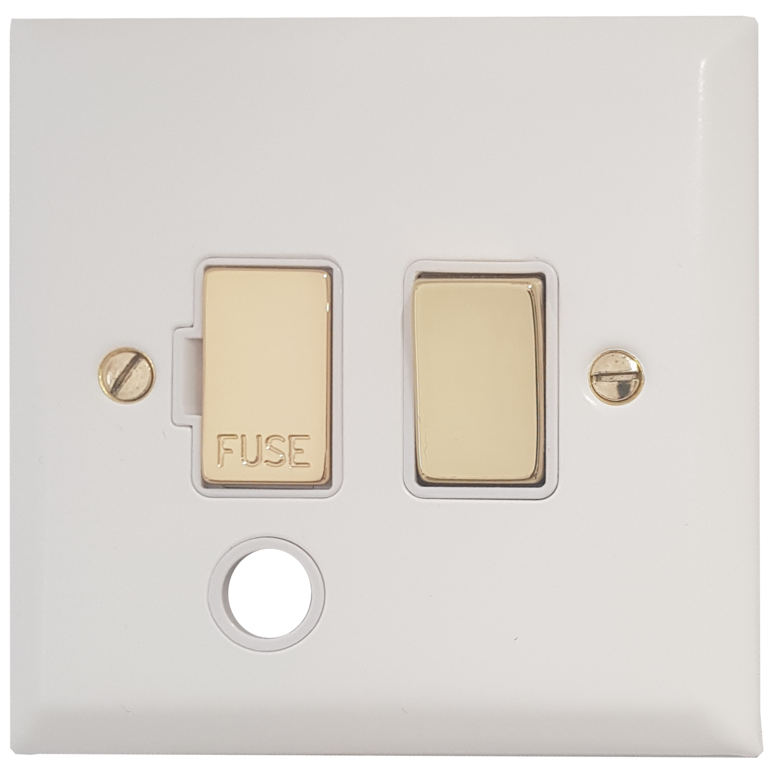 Spectrum White Switched Fused Spur with Flex Outlet (White Insert/Polished Brass Switch) - G+H SFW256 -PB