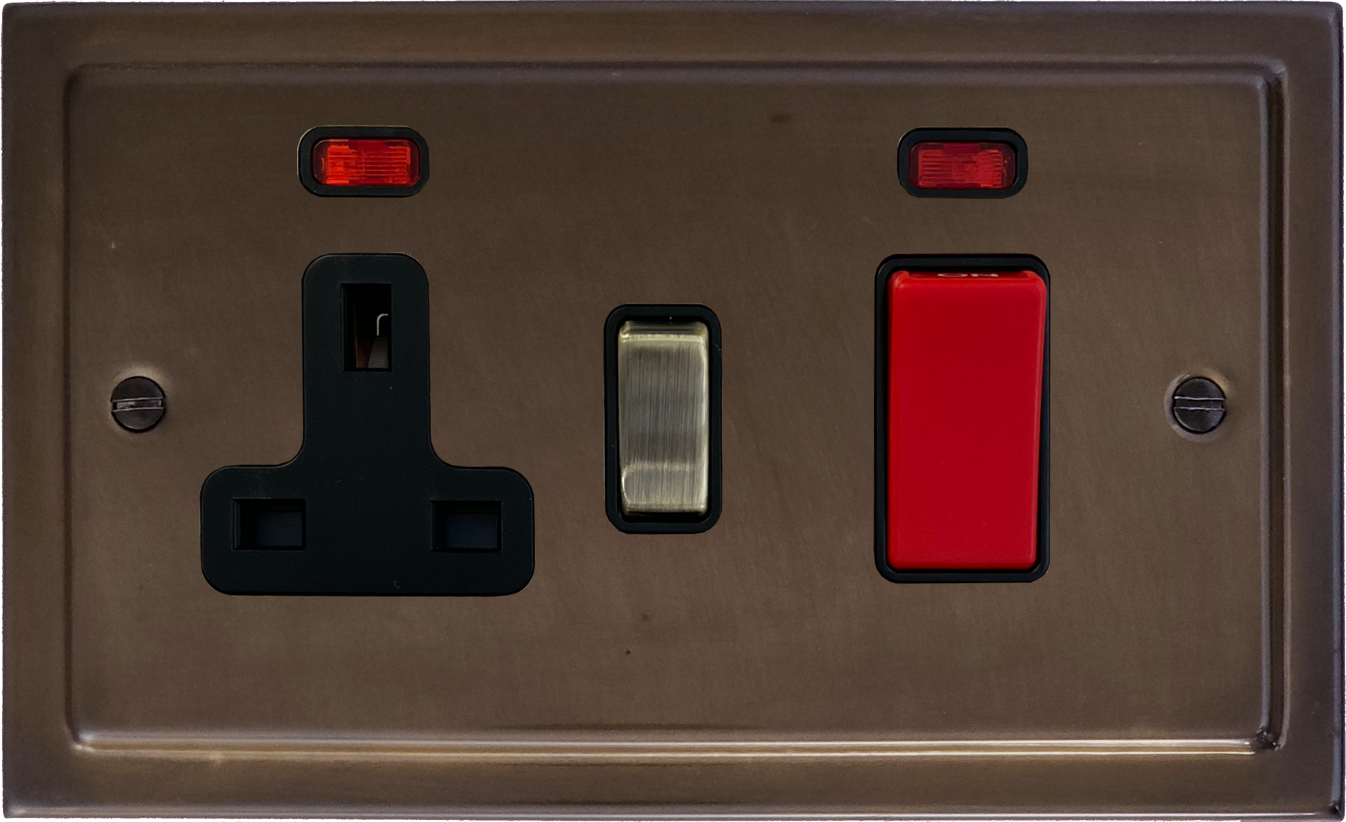Trimline Medium Bronze Cooker Switch with Socket (Black inserts/Red/Antique Brass Switch) - G+H TMBZ329-AB