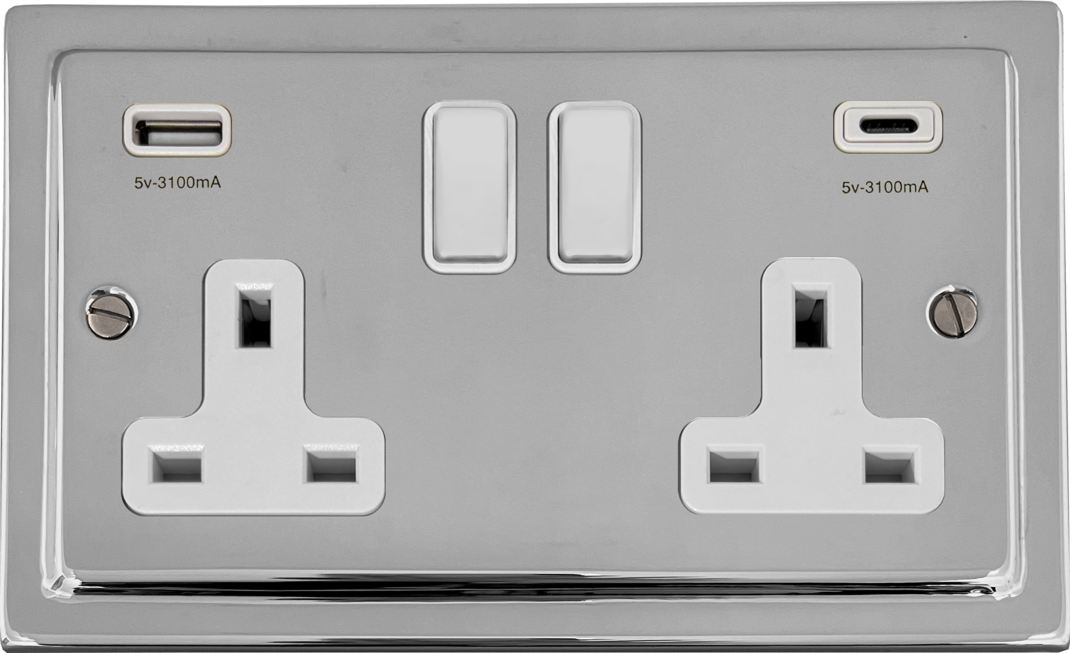 Trimline Polished Chrome Double Socket with USB (USB-A and USB-C/White Switches) - G+H TC911W