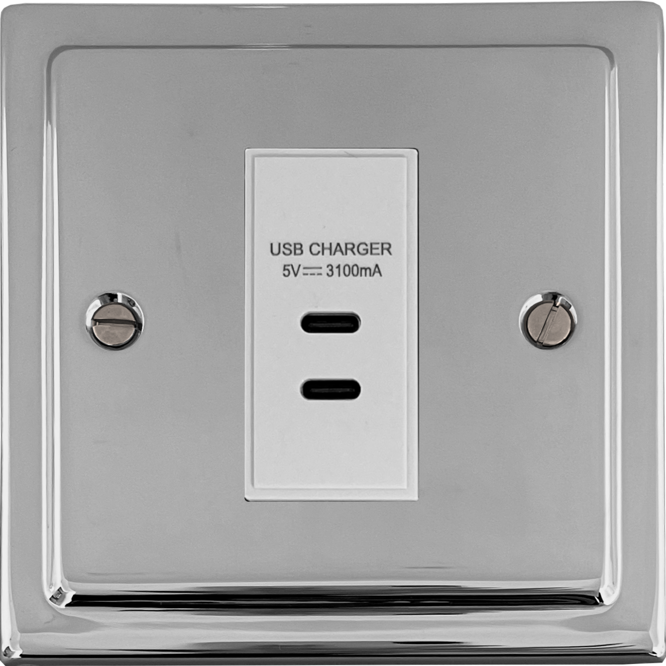 Trimline Polished Chrome USB Charger (2x USB-C) (1 Gang/White Insert) - G+H TC42W
