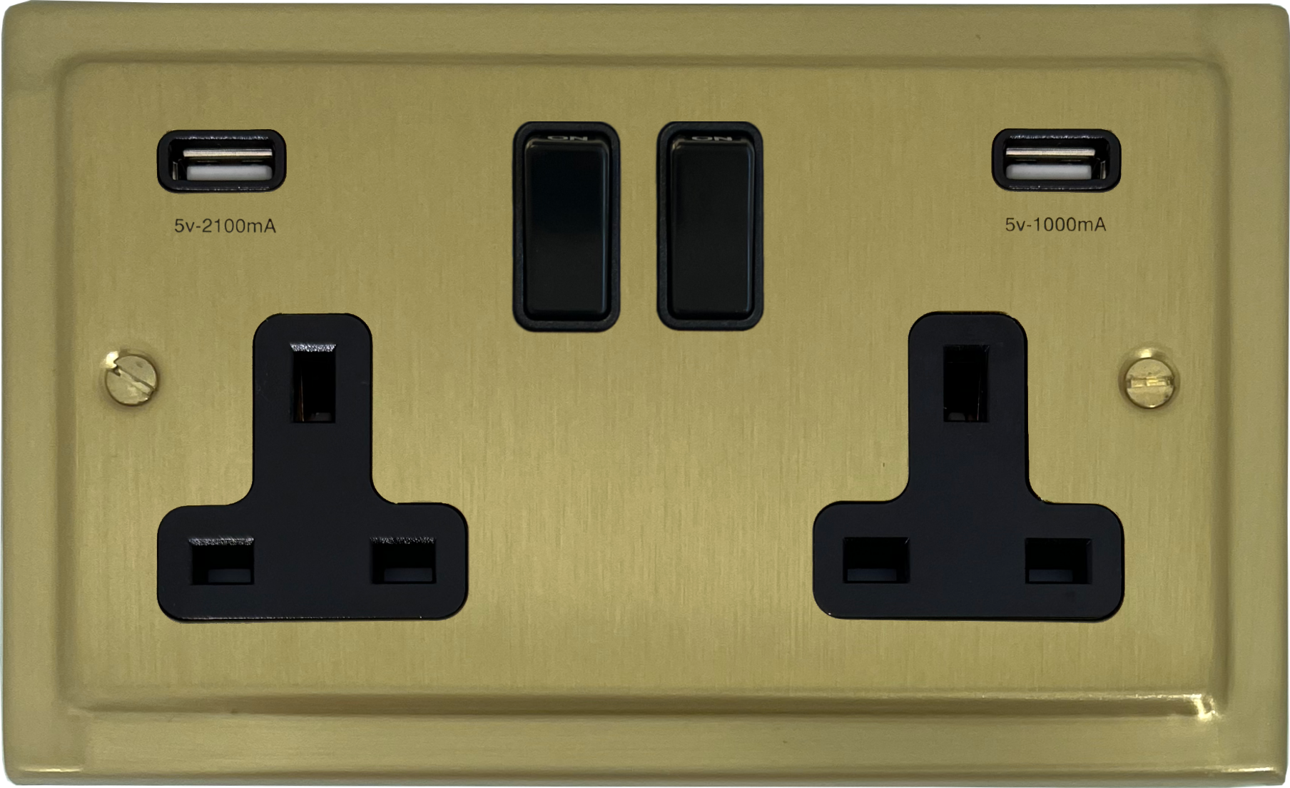 Trimline Satin Brass Double Socket with USB (Black Switches) - G+H TSB910B
