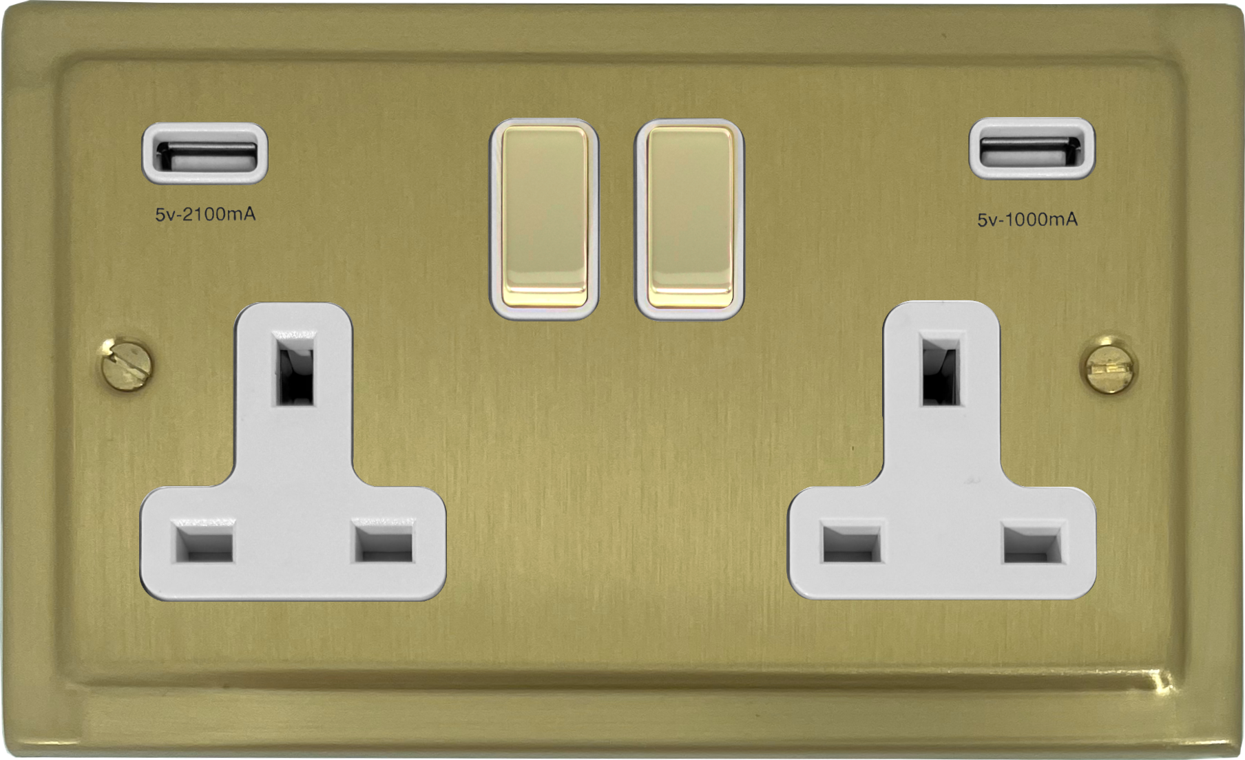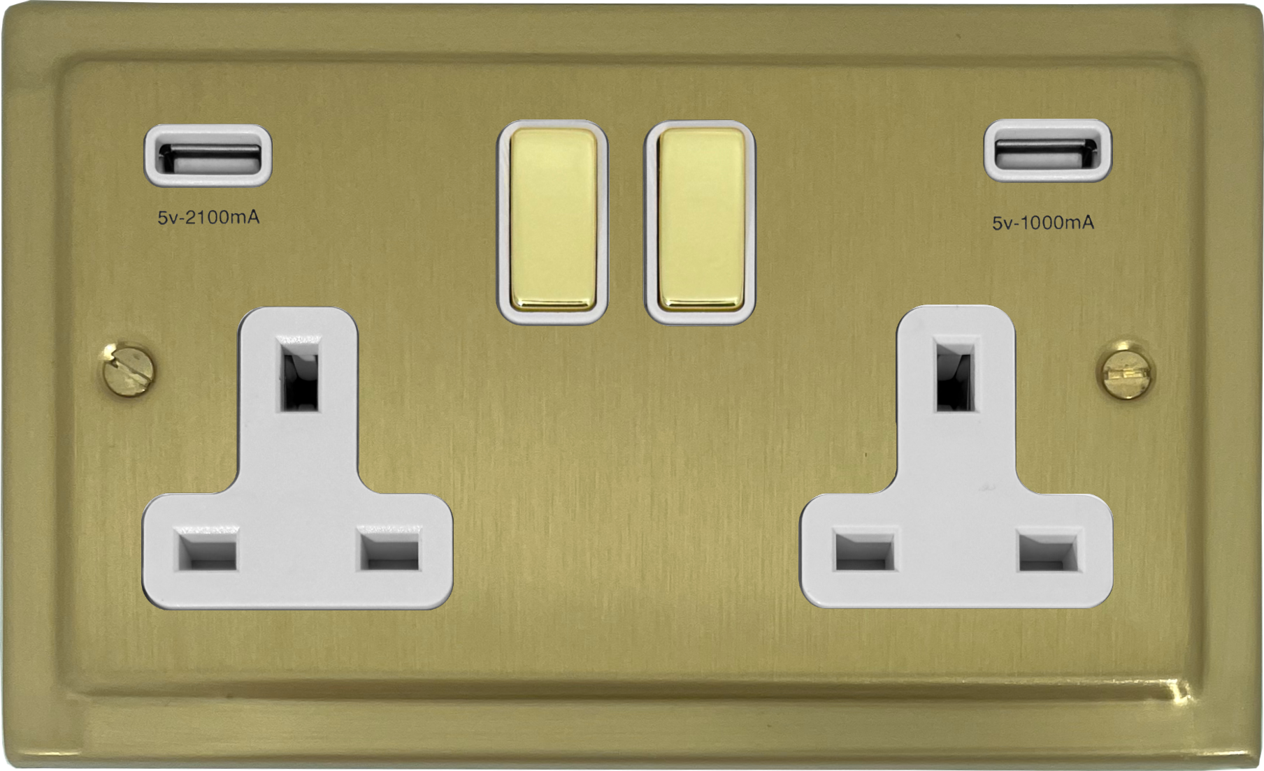 Trimline Satin Brass Double Socket with USB (Brass Switches/White Insert) - G+H TSB2910