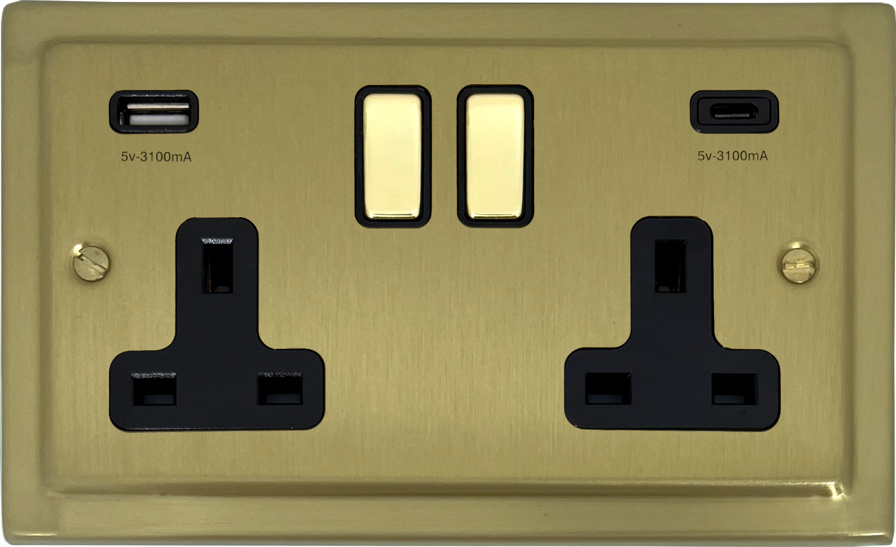 Trimline Satin Brass Double Socket with USB (USB-A and USB-C/Black Inserts/Brass Switches) - G+H TSB3911