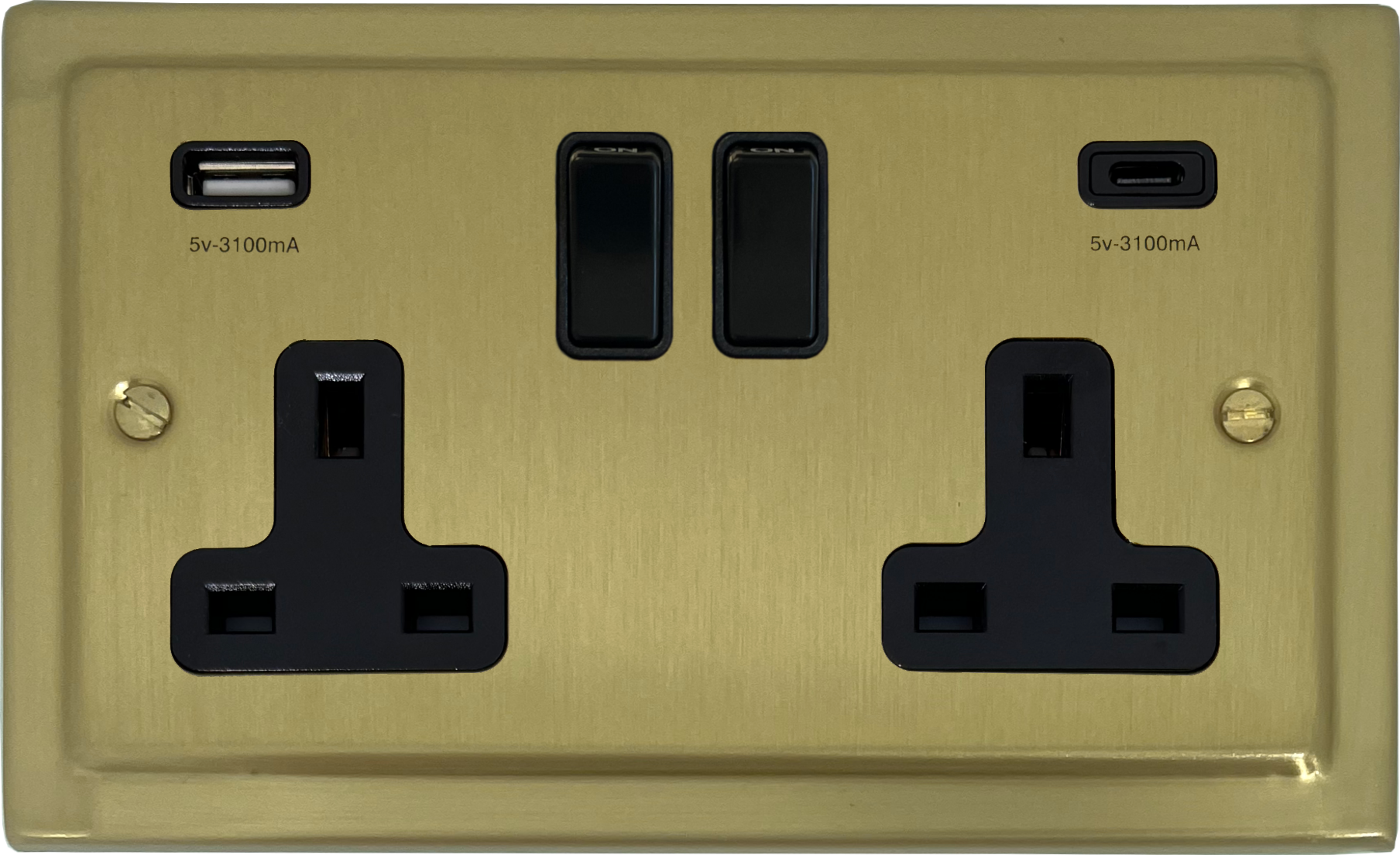 Trimline Satin Brass Double Socket with USB (USB-A and USB-C/Black Switches) - G+H TSB911B