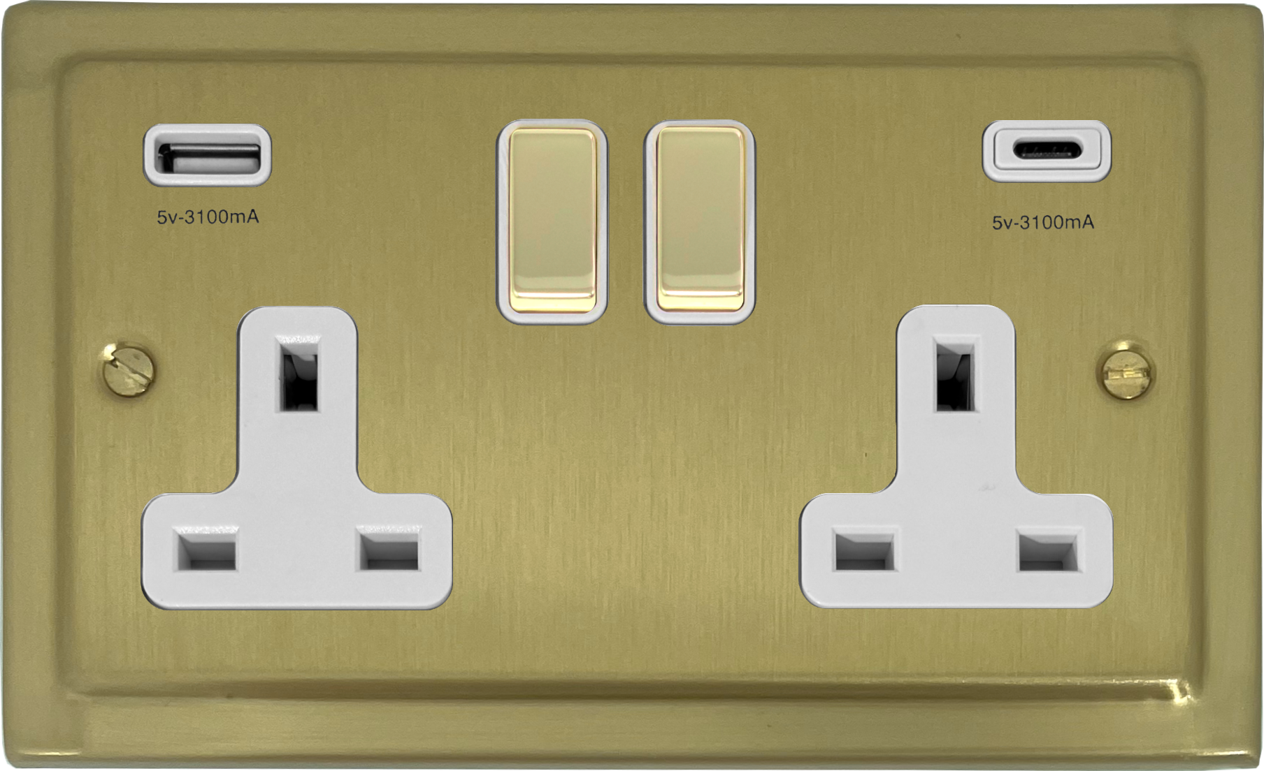 Trimline Satin Brass Double Socket with USB (USB-A and USB-C/White Inserts/Brass Switches) - G+H TSB2911